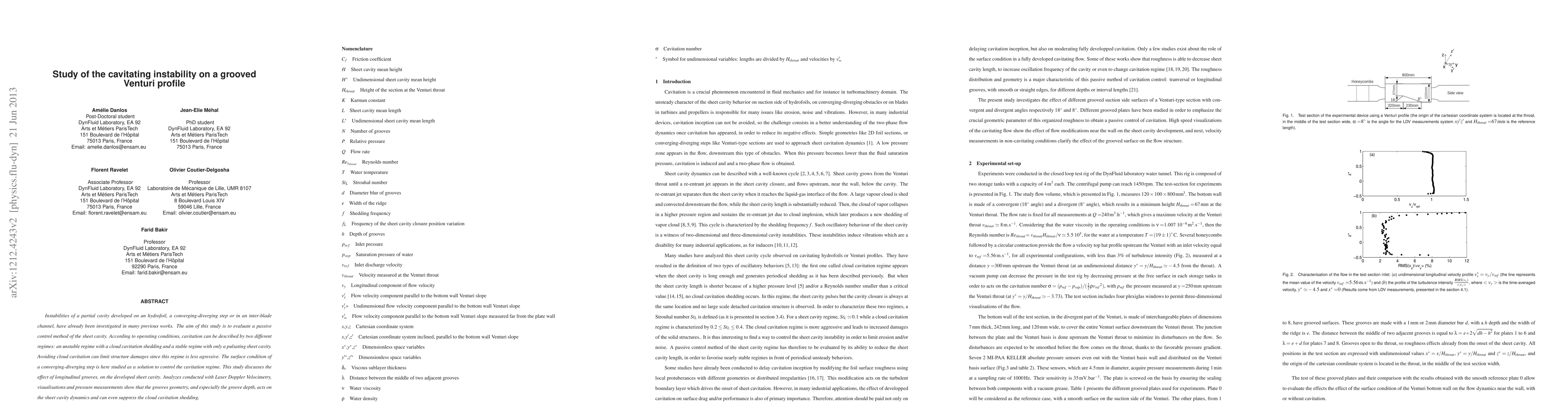 This study investigates the cavitating instability on a grooved Venturi profile to control sheet cavity dynamics. Results indicate that longitudinal grooves, particularly varying groove depth, can reduce sheet cavity length and suppress cloud cavitation, offering a passive method to mitigate structural damage.
