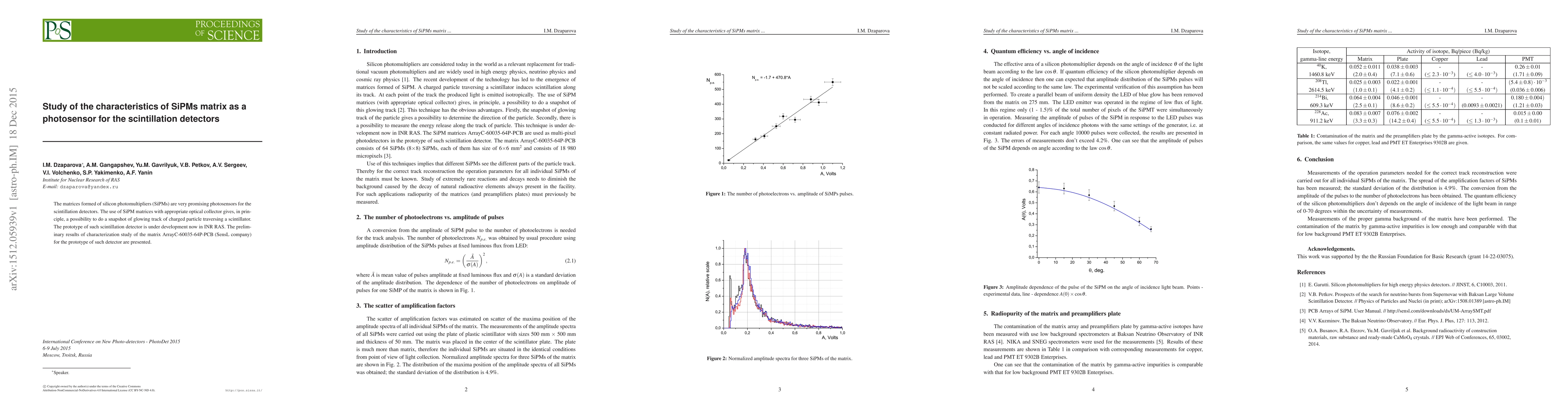 The matrices formed of silicon photomultipliers (SiPMs) are very promising photosensors for the scintillation detectors. The use of SiPM matrices with appropriate optical collector gives, in principle, a possibility to do a snapshot of glowing track of charged particle traversing a scintillator. The prototype of such scintillation detector is under development now in INR RAS. The preliminary results of characterization study of the matrix ArrayC-60035-64P-PCB (SensL company) for the prototype of such detector are presented.