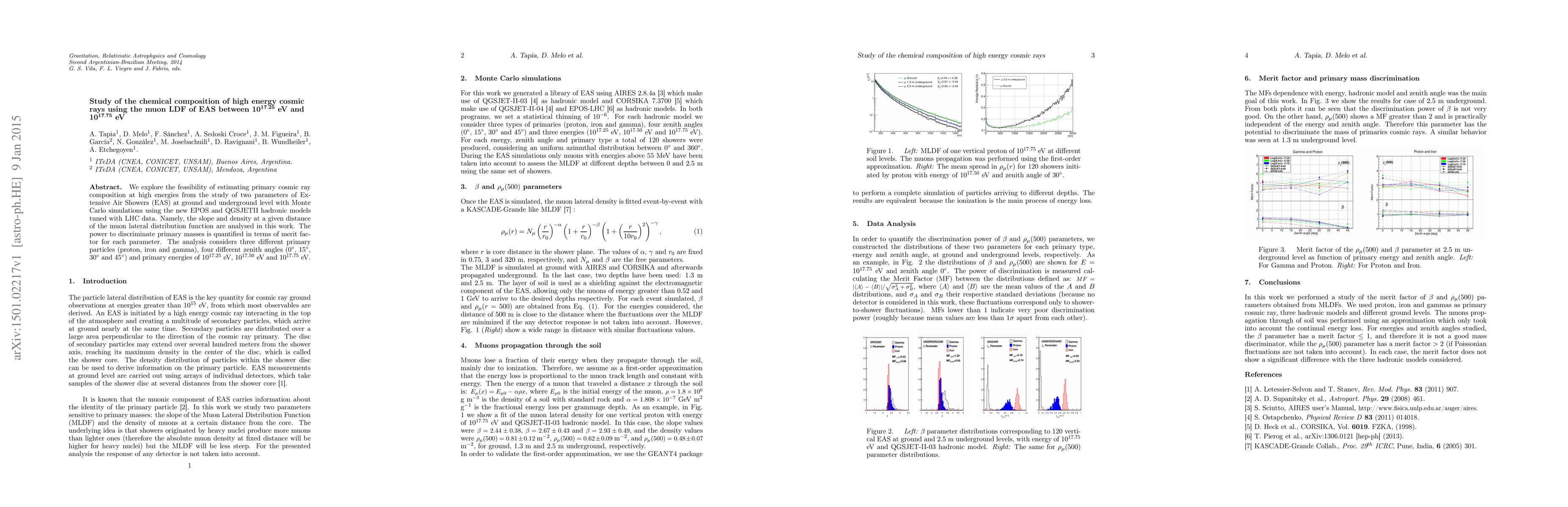We explore the feasibility of estimating primary cosmic ray composition at high energies from the study of two parameters of Extensive Air Showers (EAS) at ground and underground level with Monte Carlo simulations using the new EPOS and QGSJETII hadronic models tuned with LHC data. Namely, the slope and density at a given distance of the muon lateral distribution function are analysed in this work. The power to discriminate primary masses is quantified in terms of merit factor for each parameter. The analysis considers three different primary particles (proton, iron and gamma), four different zenith angles (0$^{\circ}$, 15$^{\circ}$, 30$^{\circ}$ and 45$^{\circ}$) and primary energies of $10^{17.25}$ eV, $10^{17.50}$ eV and $10^{17.75}$ eV.
