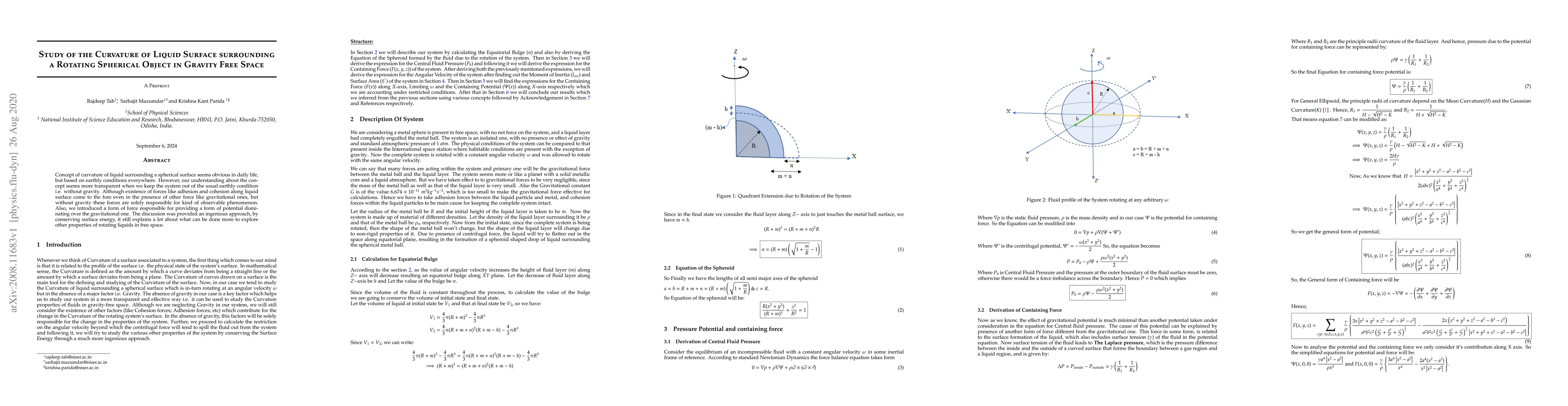 Concept of curvature of liquid surrounding a spherical surface seems obvious in daily life, but based on earthly conditions everywhere. However, our understanding about the concept seems more transparent when we keep the system out of the usual earthly condition i.e. without gravity. Although existence of forces like adhesion and cohesion along liquid surface come to the fore even in the presence of other force like gravitational ones, but without gravity these forces are solely responsible for kind of observable phenomenon. Also, we introduced a form of force responsible for providing a form of potential dominating over the gravitational one. The discussion was provided an ingenious approach, by conserving surface energy, it still explains a lot about what can be done more to explore other properties of rotating liquids in free space.
