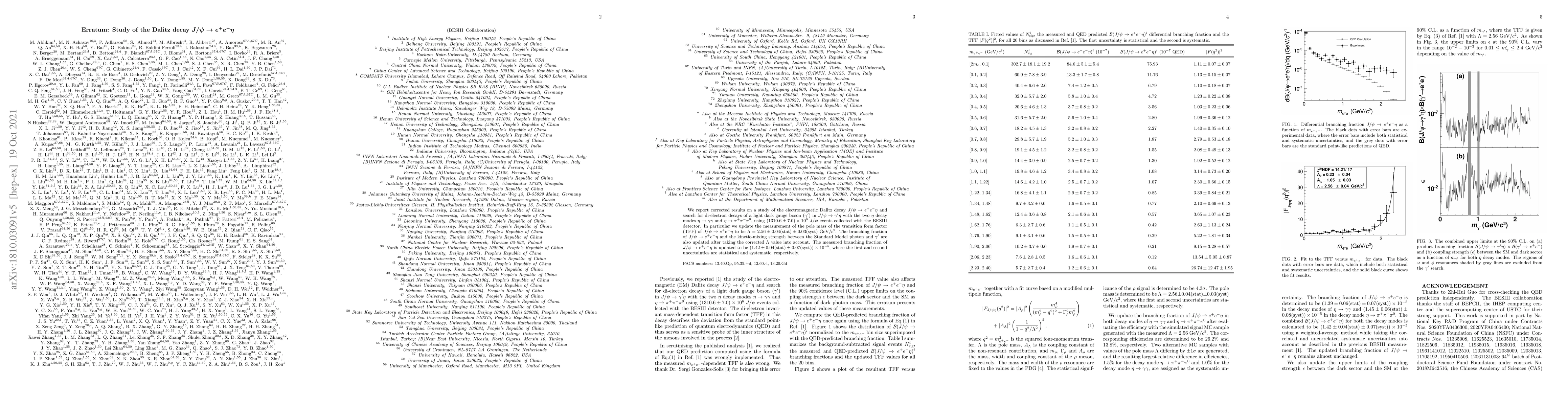 We report corrected results on a study of the electromagnetic Dalitz decay $J/\psi \to e^+e^- \eta$ and search for di-electron decays of a light dark gauge boson ($\gamma'$) in $J/\psi \to \gamma' \eta$ with the two $\eta$ decay modes $\eta \rightarrow \gamma \gamma$ and $\eta \rightarrow \pi^+\pi^-\pi^0$, using $(1310.6\pm 7.0)\times10^6$ $J/\psi$ events collected with the BESIII detector. In particular we update the measurement of the pole mass of the transition form factor (TFF) of $J/\psi \to e^+e^- \eta$ to be $\Lambda = 2.56 \pm 0.04({\rm stat}) \pm 0.03({\rm syst})$ GeV/$c^2$. The branching fraction of $J/\psi \to e^+e^-\eta$ and the kinetic-mixing strength between the Standard Model photon and $\gamma'$ are also updated after taking the corrected $\Lambda$ value into account. The measured branching fraction of $J/\psi \to e^+e^- \eta$ is updated to be $(1.42 \pm 0.04({\rm stat}) \pm 0.07 ({\rm syst}))\times 10^{-5}$, where the first and second uncertainties are statistical and systematic, respectively.