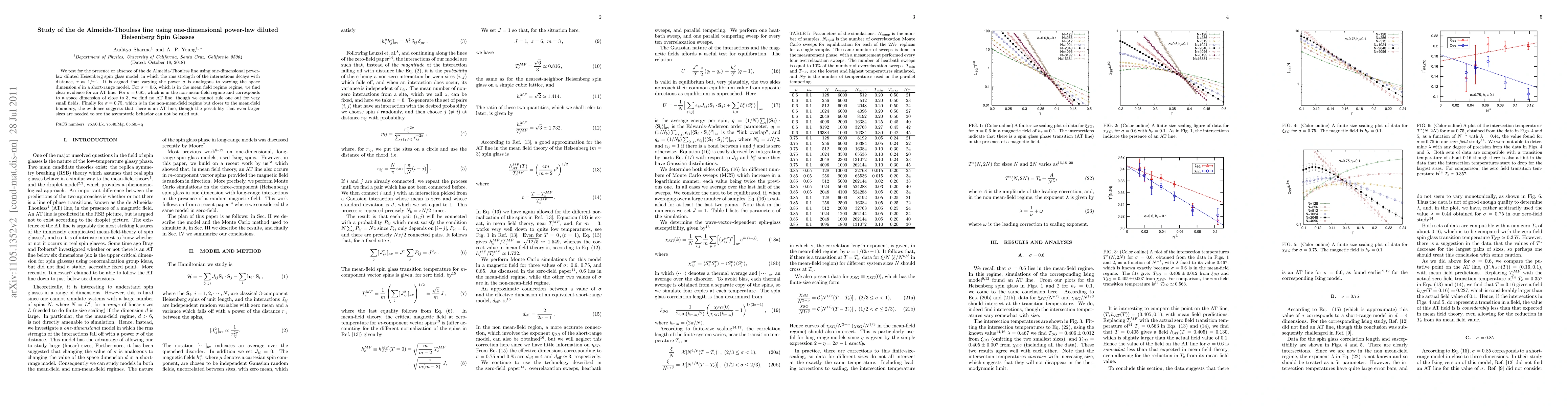 We test for the presence or absence of the de Almeida-Thouless line using one-dimensional power-law diluted Heisenberg spin glass model, in which the rms strength of the interactions decays with distance, r as 1/r^{sigma}. It is argued that varying the power sigma is analogous to varying the space dimension d in a short-range model. For sigma=0.6, which is in the mean field regime regime, we find clear evidence for an AT line. For sigma = 0.85, which is in the non-mean-field regime and corresponds to a space dimension of close to 3, we find no AT line, though we cannot rule one out for very small fields. Finally for sigma=0.75, which is in the non-mean-field regime but closer to the mean-field boundary, the evidence suggests that there is an AT line, though the possibility that even larger sizes are needed to see the asymptotic behavior can not be ruled out.
