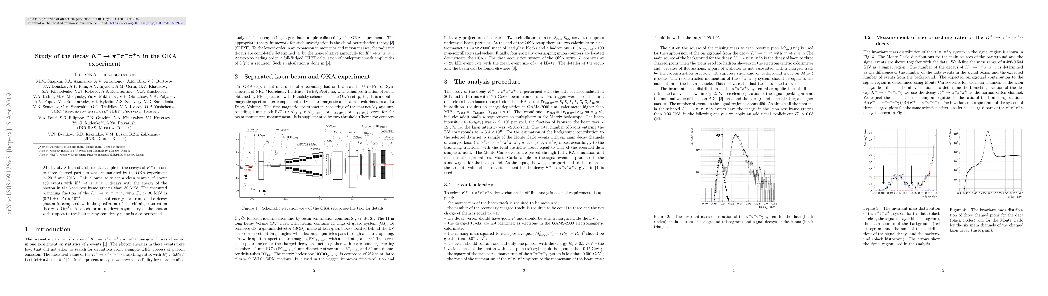 A high statistics data sample of the decays of $K^+$ mesons to three charged particles was accumulated by the OKA experiment in 2012 and 2013. This allowed to select a clean sample of about 450 events with $K^{+}\to\pi^{+}\pi^{-}\pi^{+}\gamma$ decays with the energy of the photon in the kaon rest frame greater than 30 MeV. The measured branching fraction of the $K^{+}\to\pi^{+}\pi^{-}\pi^{+}\gamma$, with $E_{\gamma}^{*}$ > 30 MeV is $(0.71 \pm 0.05) \times 10^{-5}$. The measured energy spectrum of the decay photon is compared with the prediction of the chiral perturbation theory to O$(p^{4})$. A search for an up-down asymmetry of the photon with respect to the hadronic system decay plane is also performed.