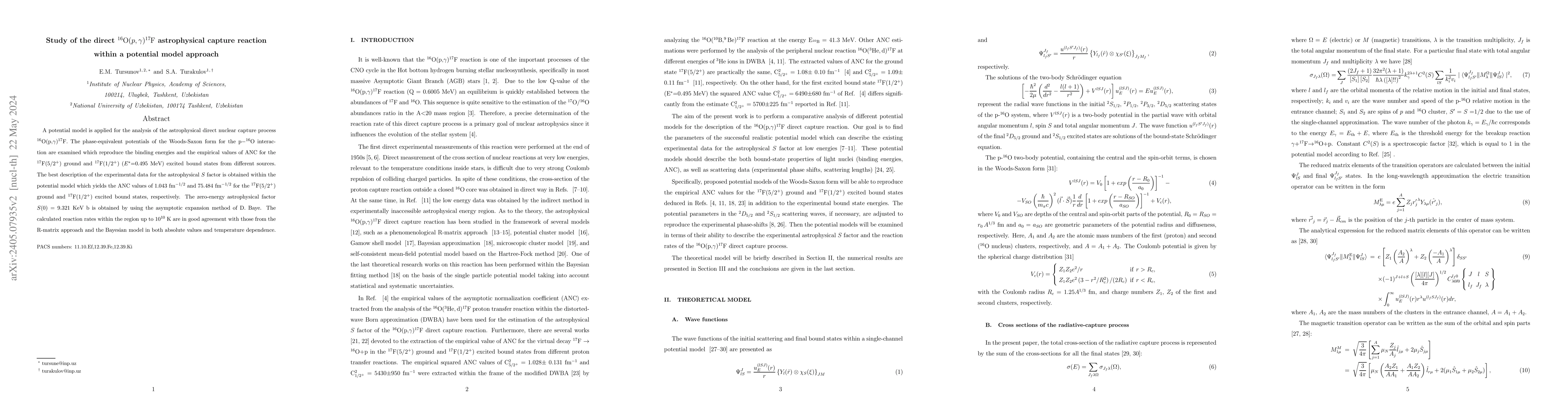 A potential model is applied for the analysis of the astrophysical direct nuclear capture process $^{16}$O(p,$\gamma)^{17}$F. The phase-equivalent potentials of the Woods-Saxon form for the p$-^{16}$O interaction are examined which reproduce the binding energies and the empirical values of ANC for the $^{17}$F(5/2$^+$) ground and $^{17}$F(1/2$^+$) ($E^*$=0.495 MeV) excited bound states from different sources. The best description of the experimental data for the astrophysical $S$ factor is obtained within the potential model which yields the ANC values of 1.043 fm$^{-1/2}$ and 75.484 fm$^{-1/2}$ for the $^{17}$F($5/2^{+}$) ground and $^{17}$F($1/2^{+}$) excited bound states, respectively. The zero-energy astrophysical factor $S(0)=9.321$ KeV b is obtained by using the asymptotic expansion method of D. Baye. The calculated reaction rates within the region up to 10$^{10}$ K are in good agreement with those from the R-matrix approach and the Bayesian model in both absolute values and temperature dependence.