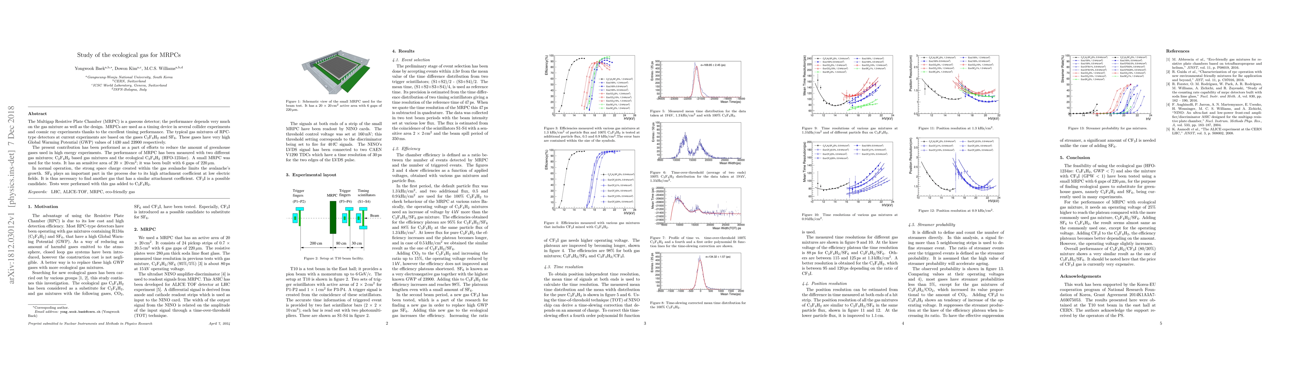 The Multigap Resistive Plate Chamber (MRPC) is a gaseous detector; the performance depends very much on the gas mixture as well as the design. MRPCs are used as a timing device in several collider experiments and cosmic ray experiments thanks to the excellent timing performance. The typical gas mixtures of RPC-type detectors at current experiments are based on the gases $\rm C_2F_4H_2$ and $\rm SF_6$. These gases have very high Global Warming Potential (GWP) values of 1430 and 23900 respectively. The present contribution has been performed as a part of efforts to reduce the amount of greenhouse gases used in high energy experiments. The performance of MRPC has been measured with two different gas mixtures; $\rm C_2F_4H_2$ based gas mixtures and the ecological $\rm C_3F_4H_2$ (HFO-1234ze). A small MRPC was used for the tests. It has an sensitive area of 20 $\times$ 20 $\rm cm^2$; it was been built with 6 gaps of 220 $\mu$m. In normal operation, the strong space charge created within the gas avalanche limits the avalanche's growth. $\rm SF_6$ plays an important part in the process due to its high attachment coefficient at low electric fields. It is thus necessary to find another gas that has a similar attachment coefficient. $\rm CF_{3}I$ is a possible candidate. Tests were performed with this gas added to $\rm C_3F_4H_2$.
