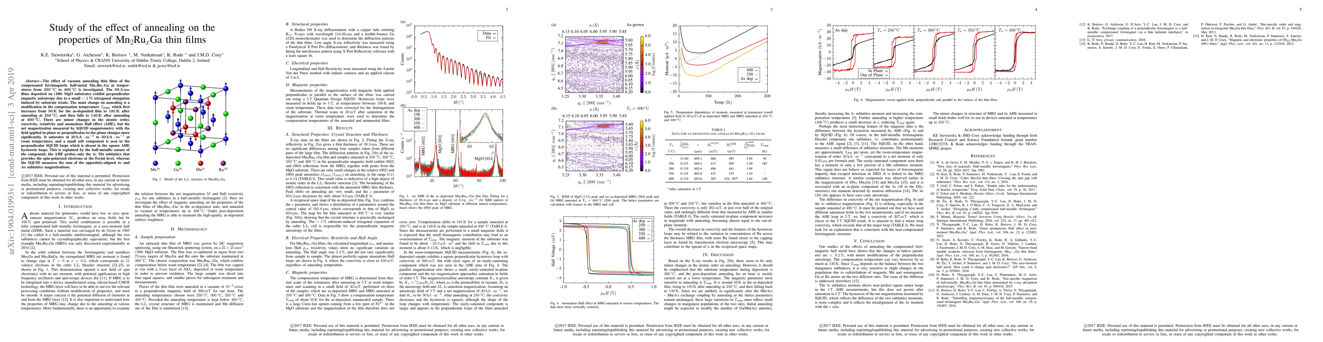 The effect of vacuum annealing thin films of the compensated ferrimagnetic half-metal Mn2RuxGa at temperatures from 250 to 400 degree Celsius is investigated. The 39.3 nm films deposited on (100) MgO substrates exhibit perpendicular magnetic anisotropy due to a small 1% tetragonal elongation induced by substrate strain. The main change on annealing is a modification in the compensation temperature, which first increases from 50 K for the as-deposited film to 185 K after annealing at 250 degree Celsius, and then falls to 140 K after annealing at 400 degree Celsius. There are minor changes in the atomic order, coercivity, resistivity and anomalous Hall effect (AHE), but the net magnetization measured by SQUID magnetometry with the field applied in-plane or perpendicular-to-the-plane changes more significantly. It saturates at 20 to 30 kA/m at room temperature, and a small soft component is seen in the perpendicular SQUID loops which is absent in the square AHE hysteresis loops. This is explained by the half-metallic nature of the compound; the AHE probes only the 4c Mn sublattice that provides the spin-polarized electrons at the Fermi level, whereas the SQUID measures the sum of the oppositely-aligned 4c and 4a sublattice magnetisations.