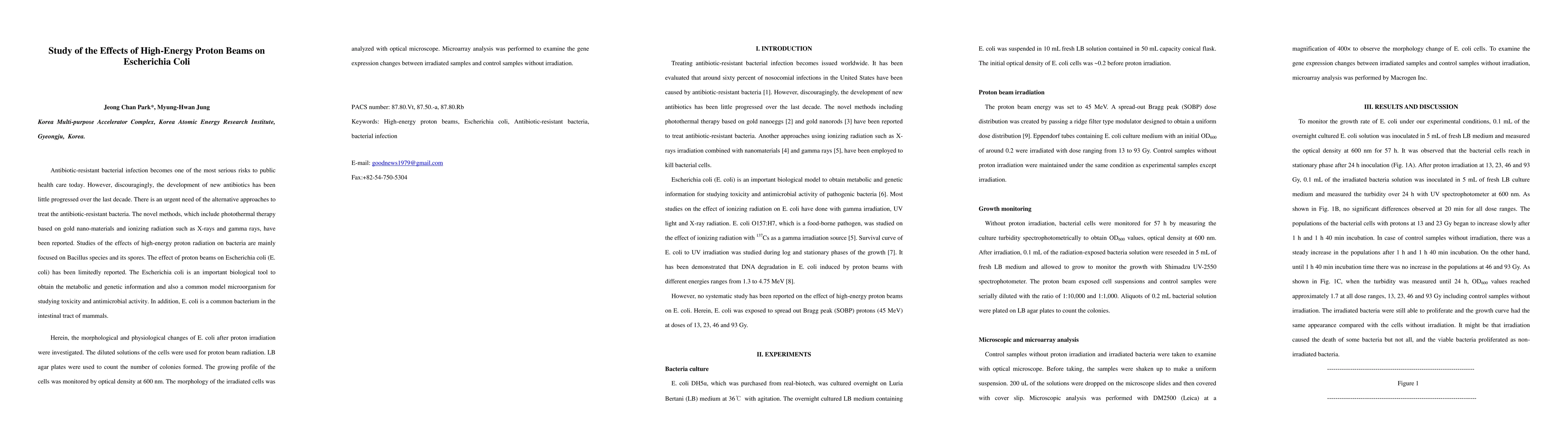 This study investigates the morphological and physiological changes in Escherichia coli (E. coli) following exposure to high-energy proton beams, aiming to explore an alternative approach to treating antibiotic-resistant bacterial infections. The research employs optical microscopy, colony counting, optical density monitoring, and microarray analysis to assess the impact of proton irradiation on E. coli's growth and gene expression.