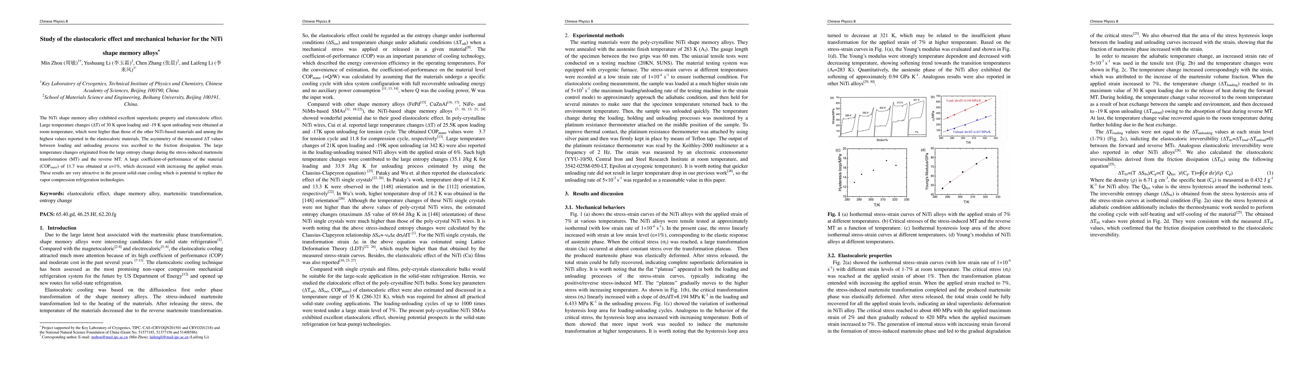 This study investigates the elastocaloric effect and mechanical behavior of NiTi shape memory alloys, revealing significant temperature changes of 30 K upon loading and -19 K upon unloading at room temperature. The large temperature shifts are attributed to substantial entropy changes during martensite transformations, showing promising potential for solid-state cooling applications.