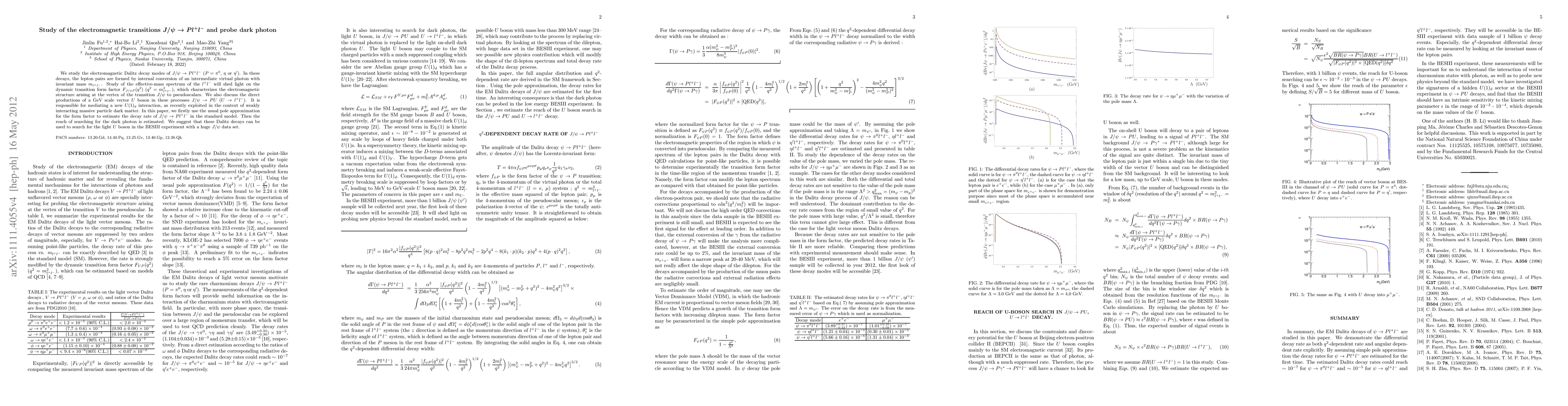 We study the electromagnetic Dalitz decay modes of $J/\psi \rightarrow P l^+l^-$ ($P= \pi^0$, $\eta$ or $\eta^\prime$). In these decays, the lepton pairs are formed by internal conversion of an intermediate virtual photon with invariant mass $m_{l^+l^-}$. Study of the effective-mass spectrum of the $l^+l^-$ will shed light on the dynamic transition form factor $F_{J/\psi P}(q^2)$ ($q^2 = m^2_{l^+l^-}$), which characterizes the electromagnetic structure arising at the vertex of the transition $J/\psi$ to pseudoscalars. We also discuss the direct productions of a GeV scale vector $U$ boson in these processes $J/\psi \rightarrow PU$ ($U\rightarrow l^+l^-$). It is responsible for mediating a new $U(1)_d$ interaction, as recently exploited in the context of weakly interacting massive particle dark matter. In this paper, we firstly use the usual pole approximation for the form factor to estimate the decay rate of $J/\psi \rightarrow P l^+l^-$ in the standard model. Then the reach of searching for the dark photon is estimated. We suggest that these Dalitz decays can be used to search for the light $U$ boson in the BESIII experiment with a huge $J/\psi$ data set.