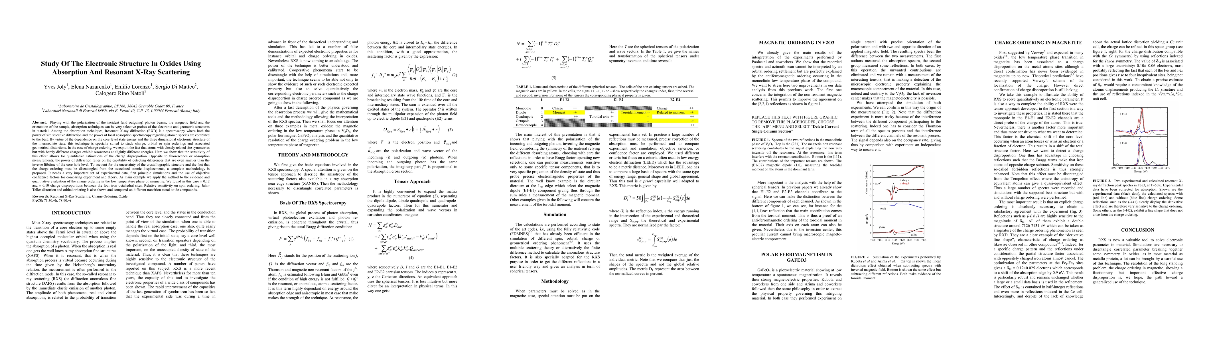 This paper explores the electronic structure in oxides using resonant X-ray scattering, combining site-selective diffraction and local absorption spectroscopy. It proposes a methodology to disentangle charge ordering from atomic displacements, demonstrating its application in magnetite and comparing sensitivities in spin, toroidal, and orbital ordering across various transition metal oxides.