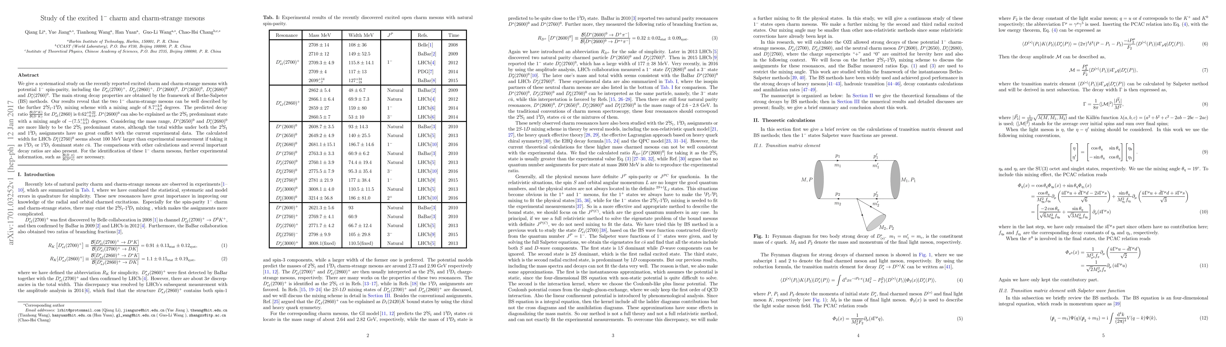 This study systematically investigates excited charm and charm-strange mesons with $1^-$ spin-parity using Bethe-Salpeter methods, revealing that $D^*_{s1}(2860)$ has a predicted decay ratio $\frac{\mathcal{B}(D^*K)}{\mathcal{B}(D~K)}$ of $0.62^{+0.22}_{-0.12}$. The $1^-$ mesons are best described by a $2^3\!S_1$-$1^3\!D_1$ mixing scheme, with specific mixing angles, and further experimental data is needed for precise identification.