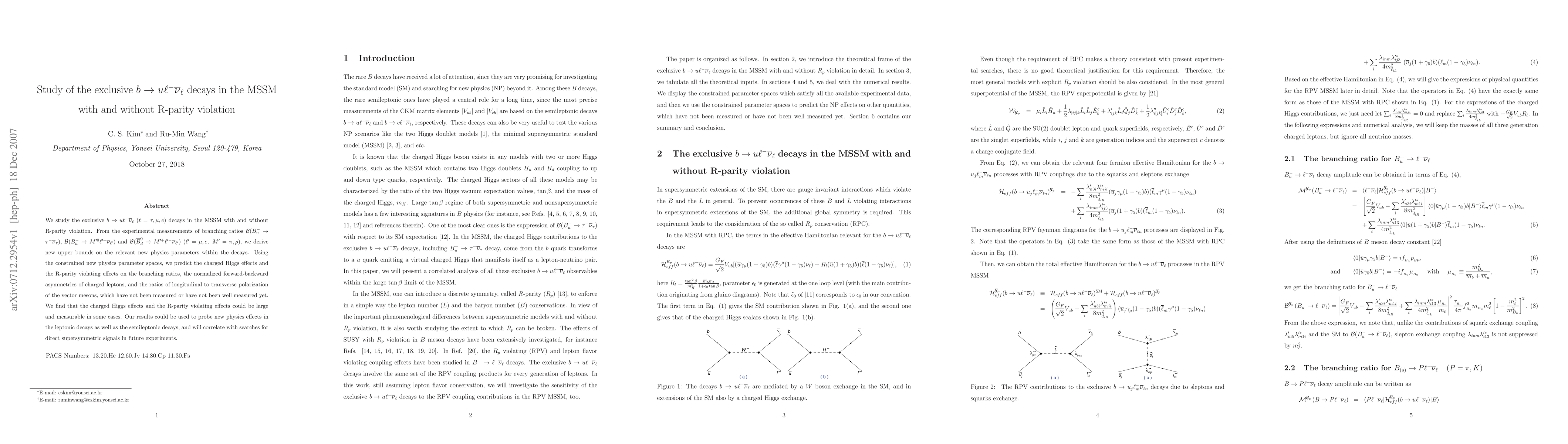 This paper investigates the exclusive $b \to u \ell^- \bar{\nu}_{\ell}$ decays in the MSSM with and without R-parity violation, deriving new upper bounds on new physics parameters from experimental measurements. The study predicts significant and measurable effects from charged Higgs and R-parity violating scenarios, which could be tested in future experiments.