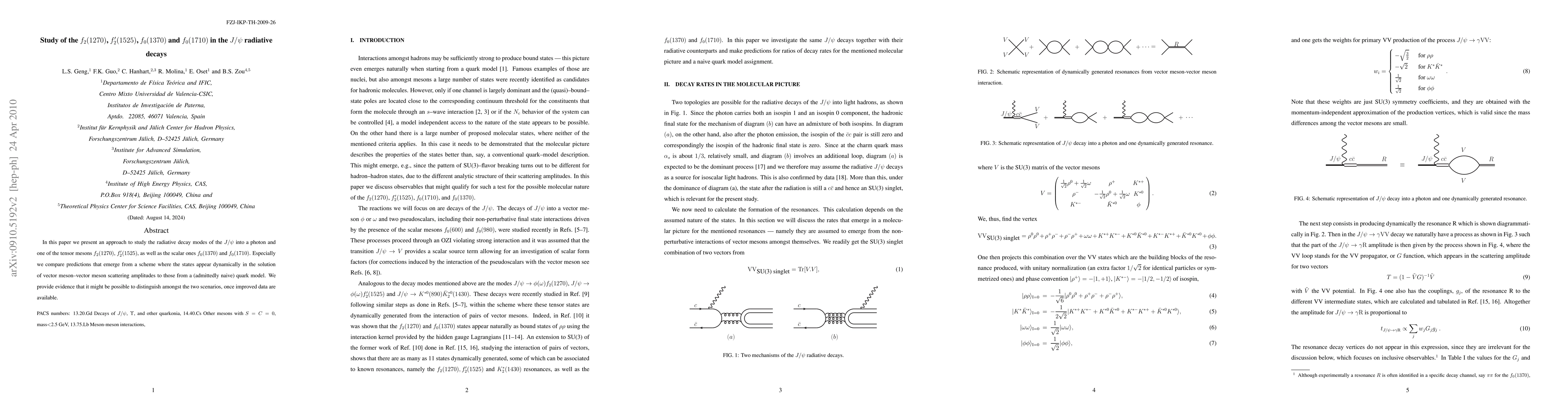 In this paper we present an approach to study the radiative decay modes of the $J/\psi$ into a photon and one of the tensor mesons $f_2(1270)$, $f'_2(1525)$, as well as the scalar ones $f_0(1370)$ and $f_0(1710)$. Especially we compare predictions that emerge from a scheme where the states appear dynamically in the solution of vector meson--vector meson scattering amplitudes to those from a (admittedly naive) quark model. We provide evidence that it might be possible to distinguish amongst the two scenarios, once improved data are available.