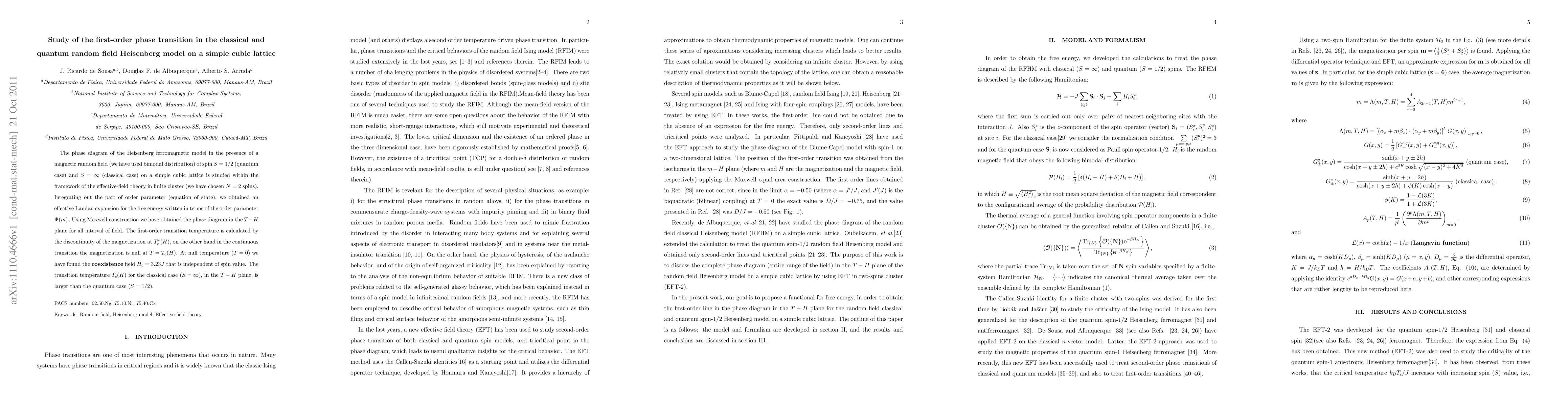 The phase diagram of the Heisenberg ferromagnetic model in the presence of a magnetic random field (we have used bimodal distribution) of spin S=1/2 (quantum case) and $S=\infty $ (classical case) on a simple cubic lattice is studied within the framework of the effective-field theory in finite cluster (we have chosen N=2 spins). Integrating out the part of order parameter (equation of state), we obtained an effective Landau expansion for the free energy written in terms of the order parameter $\Psi (m)$. Using Maxwell construction we have obtained the phase diagram in the $T-H$ plane for all interval of field. The first-order transition temperature is calculated by the discontinuity of the magnetization at $T_{c}^{\ast}(H)$, on the other hand in the continuous transition the magnetization is null at $T=T_{c}(H)$. At null temperature (T=0) we have found the \textbf{coexistence} field $H_{c}=3.23J$ that is independent of spin value. The transition temperature $T_{c}(H)$ for the classical case ($S=\infty $), in the $T-H$ plane, is larger than the quantum case (S=1/2).