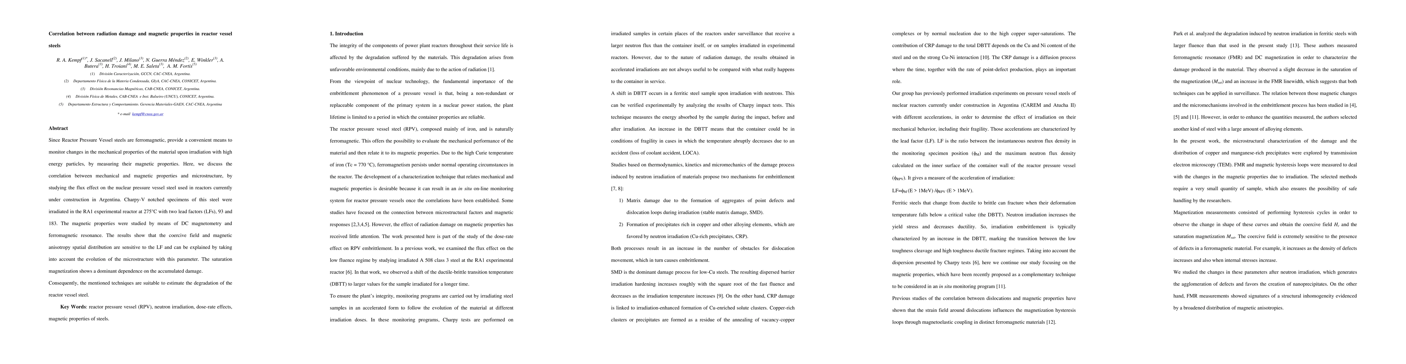 Since Reactor Pressure Vessel steels are ferromagnetic, they provide a convenient means to monitor changes in the mechanical properties of the material upon irradiation with high energy particles, by measuring their magnetic properties. Here, we discuss the correlation between these two properties (i.e. mechanical and magnetic properties) and microstructure, by studying the flux effect on the nuclear pressure vessel steel used in reactors currently under construction in Argentina. Charpy-V notched specimens of this steel were irradiated in the RA1 experimental reactor at 275{\deg}C with two lead factors (LFs), 93 and 183. The magnetic properties were studied by means of DC magnetometry and ferromagnetic resonance. The results show that the coercive field and magnetic anisotropy spatial distribution are sensitive to the LF and can be explained by taking into account the evolution of the microstructure with this parameter. The saturation magnetization shows a dominant dependence on the accumulated damage. Consequently, the mentioned techniques are suitable to estimate the degradation of the reactor vessel steel.