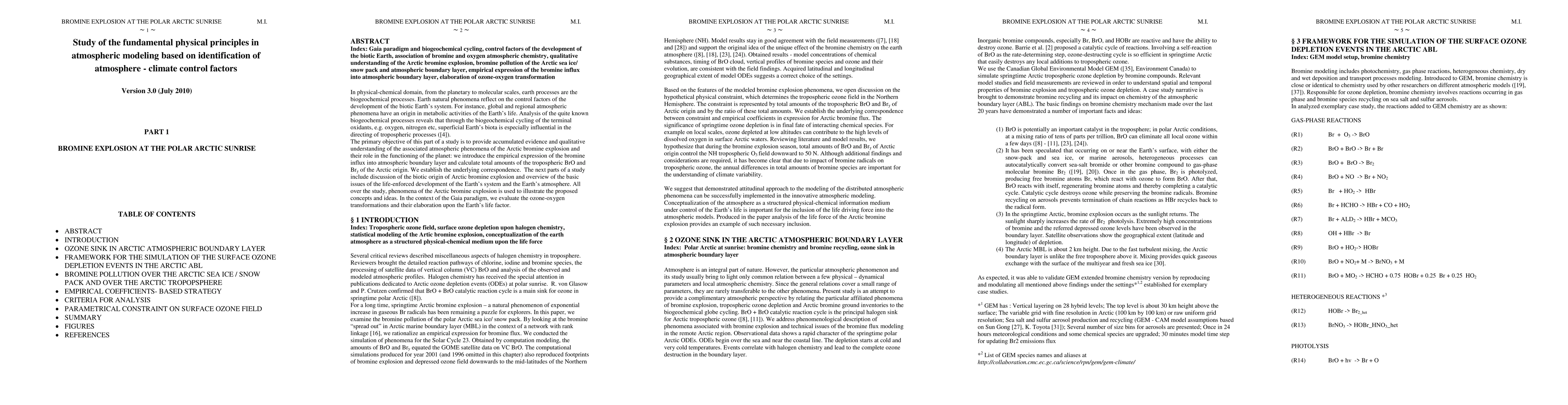 We attempt is to provide accumulated evidence and qualitative understanding of the associated atmospheric phenomena of the Arctic bromine explosion and their role in the functioning of the biotic Earth. We rationalize the empirical expression of the bromine influx into atmospheric boundary layer and calculate total amounts of the tropospheric BrO and Bry of the Arctic origin. Based on the quantities and partitioning of the reactive bromine species, we estimate the biogeochemical parametric constraint on the surface ozone field of the springtime NH. The constraint expresses strong relationship between atmosphere-climate control factors of the Earth's life and of external energy source. Physical atmosphere can be seen as a complex network of maximum complexity. Henceforth, we analyze the network context of the Arctic bromine pollution. We suggest that demonstrated attitudinal approach to the distributed surface flux would be successfully used in the innovative atmospheric modeling. The analysis is illustrated by GEM model results which stay in a good agreement with the observational data and support the original idea of the global NH effect of bromine chemistry.