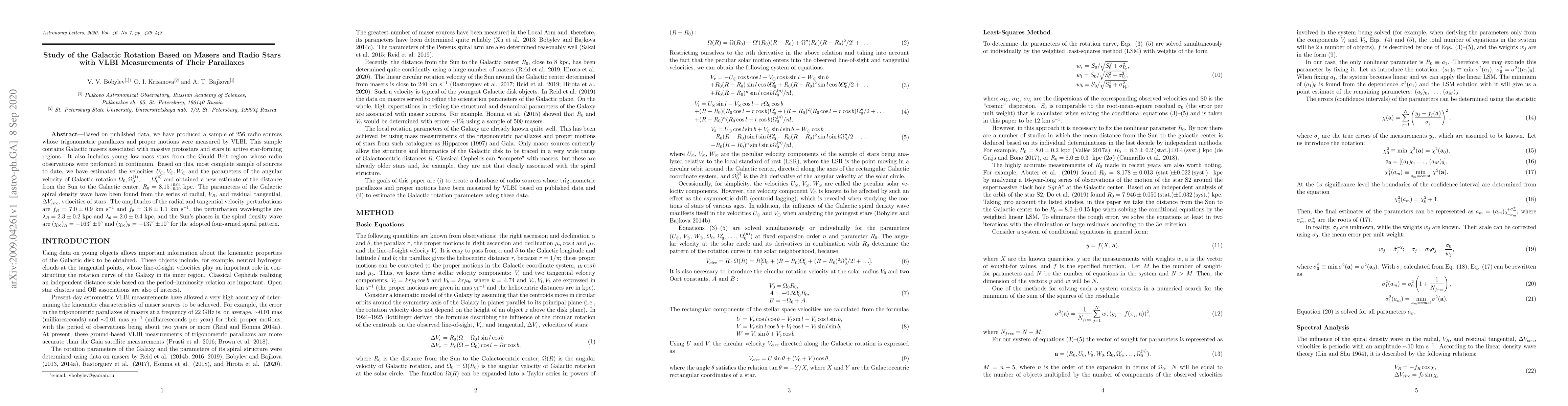 Based on published data, we have produced a sample of 256 radio sources whose trigonometric parallaxes and proper motions were measured by VLBI. This sample contains Galactic masers associated with massive protostars and stars in active star-forming regions. It also includes young low-mass stars from the Gould Belt region whose radio observations were performed in continuum. Based on this, most complete sample of sources to date, we have estimated the velocities $(U,V,W)_\odot$ and the parameters of the angular velocity of Galactic rotation $\Omega_0, \Omega^{(1)}_0, ... , \Omega^{(4)}_0$ and obtained a new estimate of the distance fromthe Sun to the Galactic center, $R_0=8.15^{+0.04}_{-0.20}$ kpc. The parameters of the Galactic spiral density wave have been found from the series of radial, $V_R$, and residual tangential, $\Delta V_{circ}$, velocities of stars. The amplitudes of the radial and tangential velocity perturbations are $f_R=7.0\pm0.9$ km s$^{-1}$ and $f_\theta=3.8\pm1.1$ km s$^{-1}$, the perturbation wavelengths are $\lambda_R=2.3\pm0.2$ kpc and $\lambda_\theta=2.0\pm0.4$ kpc, and the Sun's phases in the spiral density wave are $(\chi_\odot)_R=-163^\circ\pm9^\circ$ and $(\chi_\odot)_\theta=-137^\circ\pm10^\circ$ for the adopted four-armed spiral pattern.