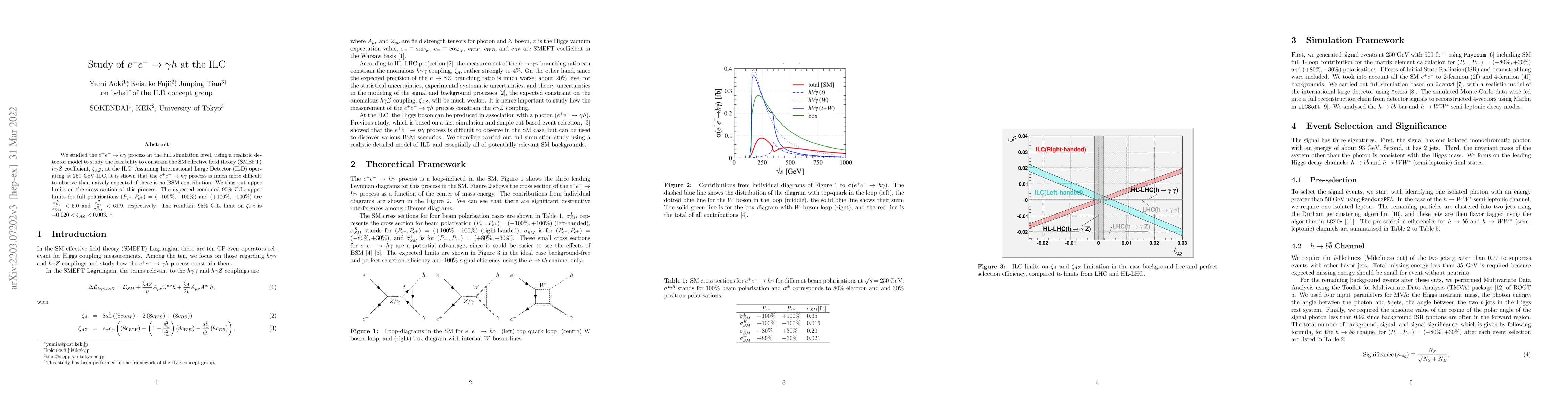 We studied the $e^+e^- \to h \gamma$ process at the full simulation level, using a realistic detector model to study the feasibility to constrain the SM effective field theory (SMEFT) $h \gamma Z$ coefficient, $\zeta_{AZ}$, at the ILC. Assuming International Large Detector (ILD) operating at 250 GeV ILC, it is shown that the $e^+e^- \to h\gamma$ process is much more difficult to observe than naively expected if there is no BSM contribution. We thus put upper limits on the cross section of this process. The expected combined 95% C.L. upper limits for full polarisations $(P_{e^-}, P_{e^+})=(-100\%, +100\%)$ and $(+100\%, -100\%)$ are $\frac{\sigma_{h \gamma}^{L}}{\sigma_{S M}^{L}}<5.0$ and $\frac{\sigma_{h \gamma}^{R}}{\sigma_{S M}^{R}}<61.9$, respectively. The resultant 95% C.L. limit on $\zeta_{AZ}$ is $-0.020<\zeta_{A Z}<0.003$.