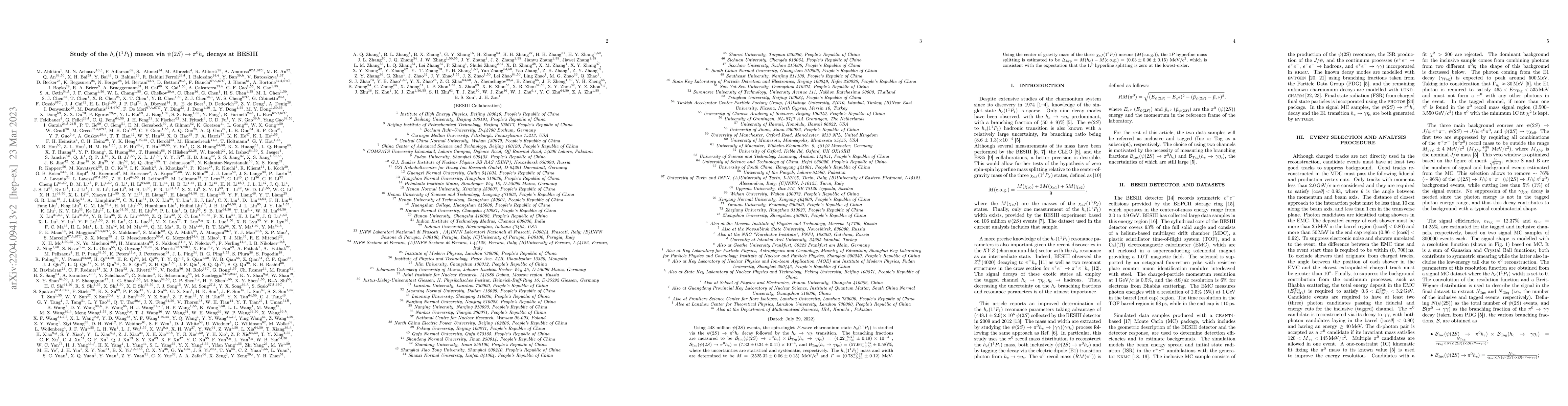 This study investigates the $h_c$(1$^1P_1$) meson through $\psi(2S)$ decays into $\pi^0 h_c$ followed by $h_c \to \gamma \eta_c$ using 448 million $\psi(2S)$ events. The branching fractions and mass/width of the $h_c$ meson are measured, revealing a consistent hyperfine mass splitting with theoretical predictions.