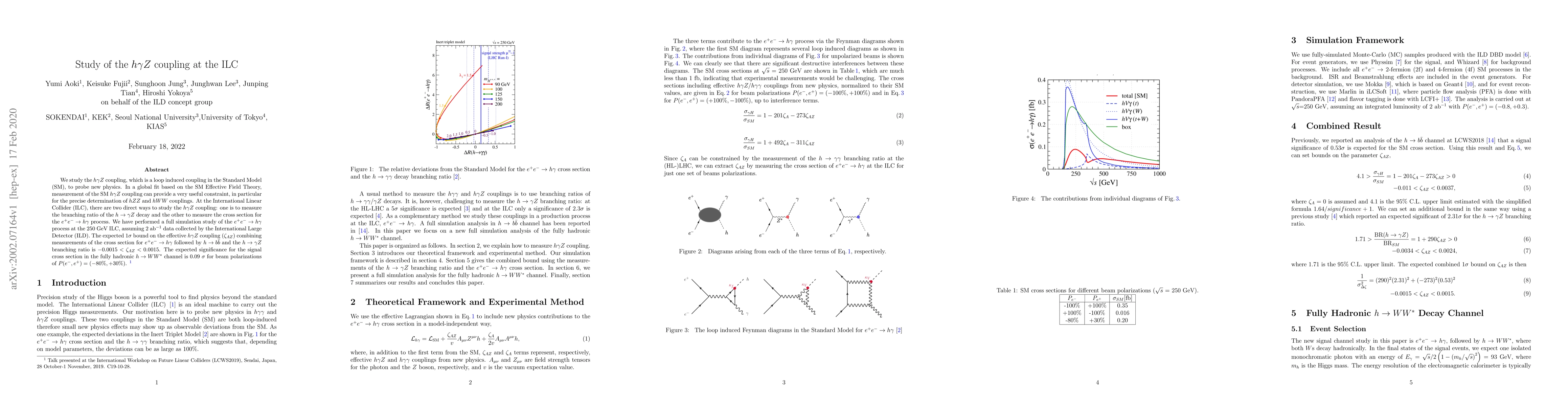 We study the $h \gamma Z$ coupling, which is a loop induced coupling in the Standard Model (SM), to probe new physics. In a global fit based on the SM Effective Field Theory, measurement of the SM $h \gamma Z$ coupling can provide a very useful constraint, in particular for the precise determination of $hZZ$ and $hWW$ couplings. At the International Linear Collider (ILC), there are two direct ways to study the $h \gamma Z$ coupling: one is to measure the branching ratio of the $h \to \gamma Z$ decay and the other to measure the cross section for the $e^+e^- \to h \gamma$ process. We have performed a full simulation study of the $e^+e^- \to h \gamma$ process at the 250 GeV ILC, assuming 2 ab$^{-1}$ data collected by the International Large Detector (ILD). The expected 1$\sigma$ bound on the effective $h\gamma Z$ coupling ($\zeta_{AZ}$) combining measurements of the cross section for $e^+e^- \to h \gamma$ followed by $h \to b \bar{b}$ and the $h \to \gamma Z$ branching ratio is $-0.0015<\zeta_{AZ}<0.0015$. The expected significance for the signal cross section in the fully hadronic $h \to WW^*$ channel is 0.09 $\sigma$ for beam polarizations of $P(e^-,e^+)=(-80\%,+30\%)$.