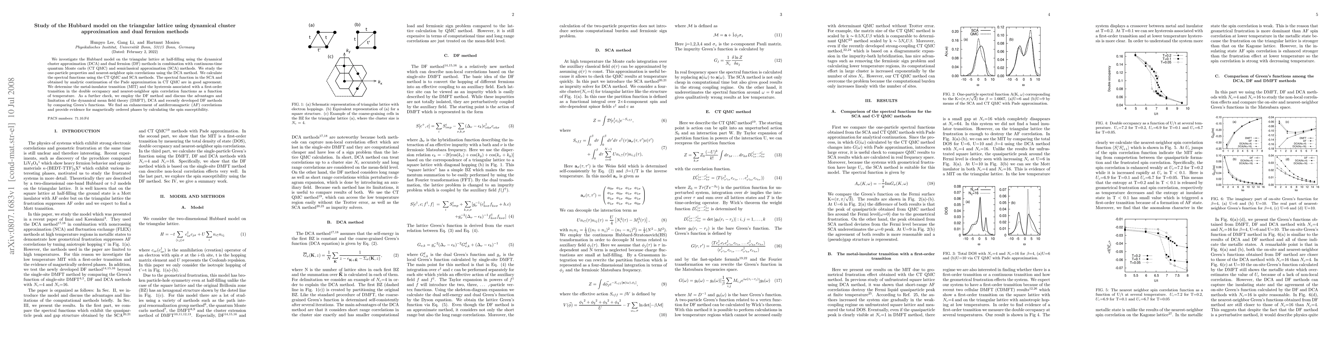 Researchers studied the Hubbard model on a triangular lattice, finding evidence for metal-insulator transitions and magnetically ordered phases, using combined computational methods to analyze one-particle properties and spin correlations.