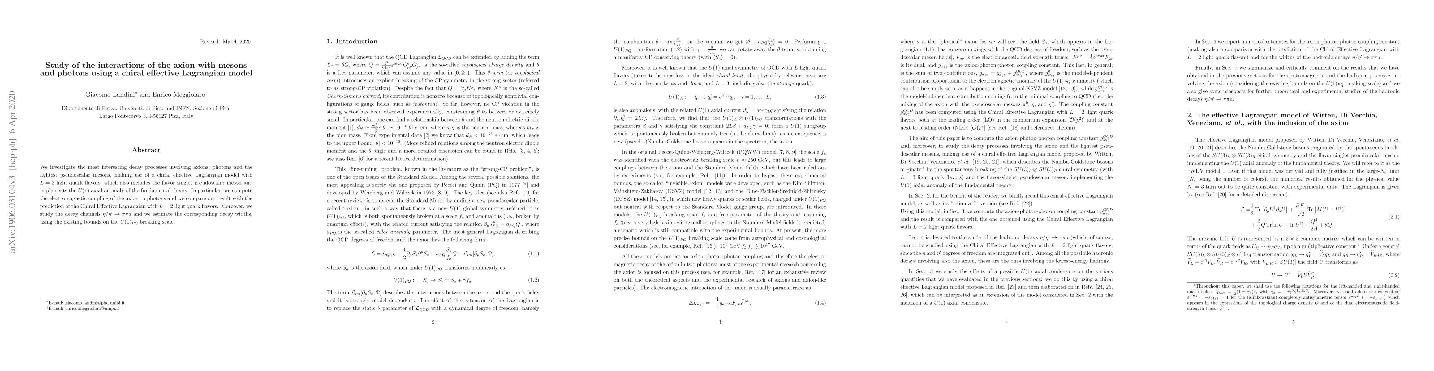 This paper explores axion interactions with mesons and photons via a chiral effective Lagrangian model with three light quark flavors, focusing on decay processes like $\eta/\eta'\rightarrow \pi\pi a$ and comparing electromagnetic coupling results with a model using two light quark flavors. It estimates decay widths based on current $U(1)_{PQ}$ breaking scale constraints.