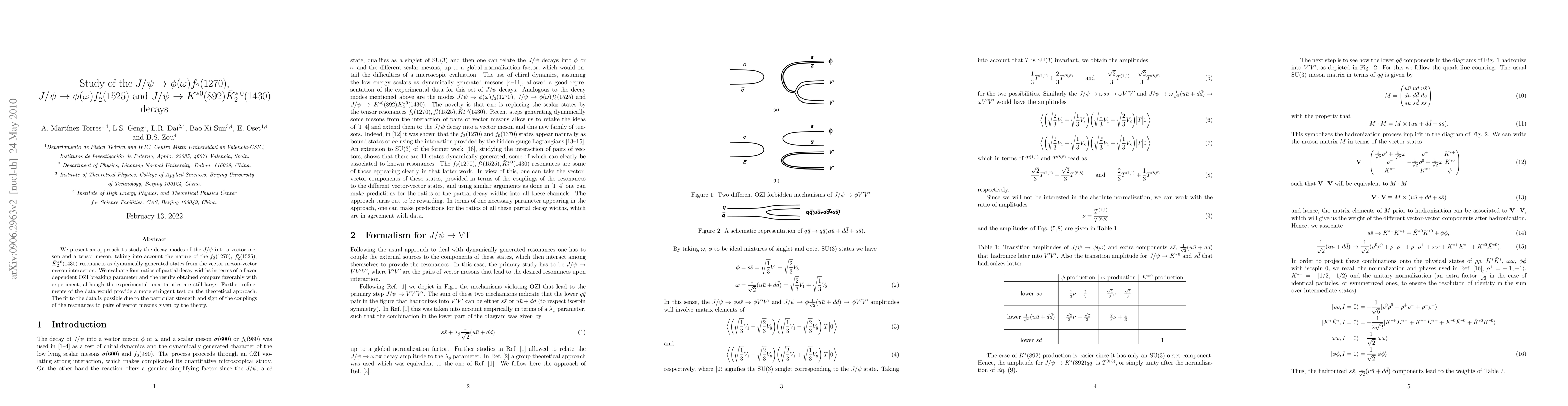 We present an approach to study the decay modes of the $J/\psi$ into a vector meson and a tensor meson, taking into account the nature of the $f_2(1270)$, $f'_2(1525)$, $\bar{K}^{* 0}_2(1430)$ resonances as dynamically generated states from the vector meson-vector meson interaction. We evaluate four ratios of partial decay widths in terms of a flavor dependent OZI breaking parameter and the results obtained compare favorably with experiment. The fit to the data is possible due to the particular strength and sign of the couplings of the resonances to pairs of vector mesons given by the theory, thus providing a nontrivial test for the idea of these tensor states as dynamically generated from the vector-vector interaction.