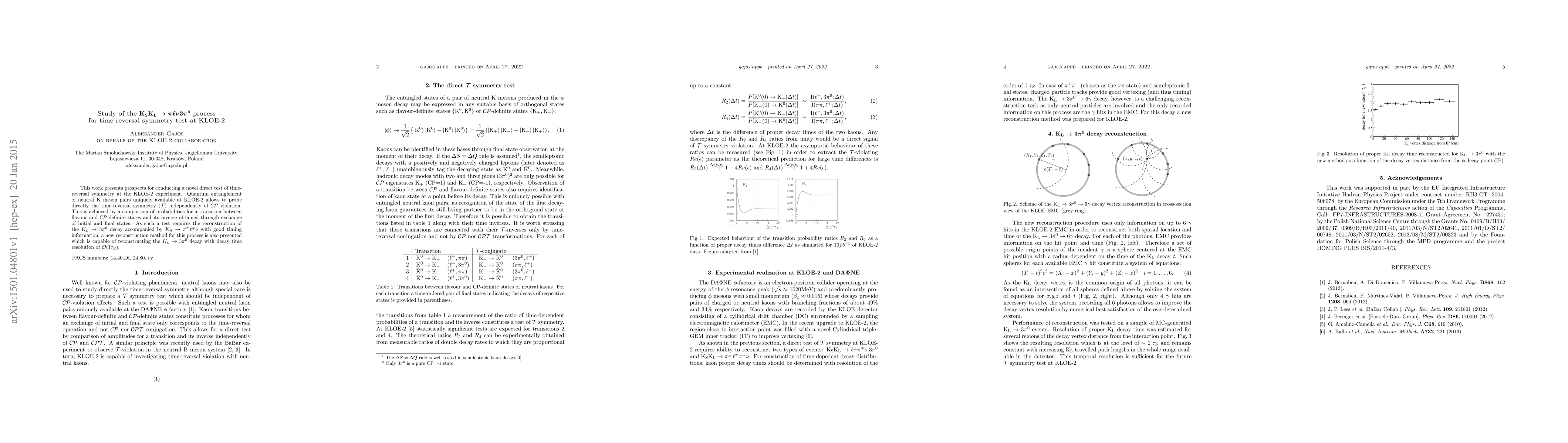 This work presents prospects for conducting a novel direct test of time-reversal symmetry at the KLOE-2 experiment. Quantum entanglement of neutral K meson pairs uniquely available at KLOE-2 allows to probe directly the time-reversal symmetry (T) independently of CP violation. This is achieved by a comparison of probabilities for a transition between flavour and CP-definite states and its inverse obtained through exchange of initial and final states. As such a test requires the reconstruction of the $K_L\to 3\pi^0$ decay accompanied by $K_S\to\pi^{\pm}\ell^{\mp}\nu$ with good timing information, a new reconstruction method for this process is also presented which is capable of reconstructing the $K_L\to 3\pi^0$ decay with decay time resolution of O(1$\tau_S$).