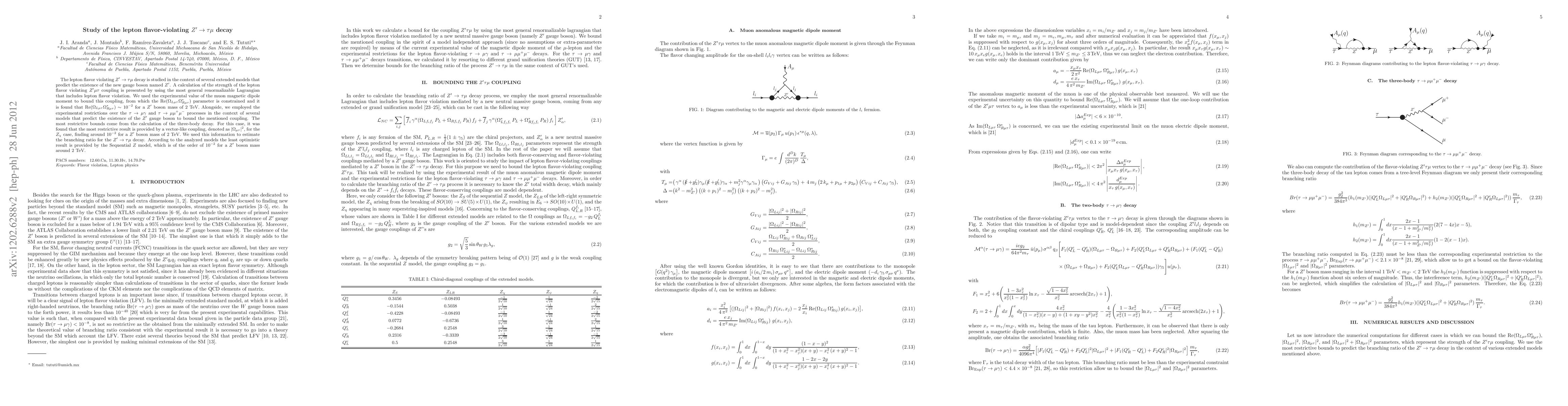 This study investigates the lepton flavor-violating decay $Z^\prime\to\tau\mu$ within extended models predicting a new gauge boson $Z^\prime$. The research constrains the $Z^\prime\mu\tau$ coupling using experimental data, finding $\mathrm{Re}(\Omega_{L\mu\tau}\Omega^\ast_{R\mu\tau})\sim 10^{-2}$ for a 2 TeV mass, and estimates the branching ratio for the decay, which is around $10^{-2}$ for a 2 TeV $Z^\prime$ boson.