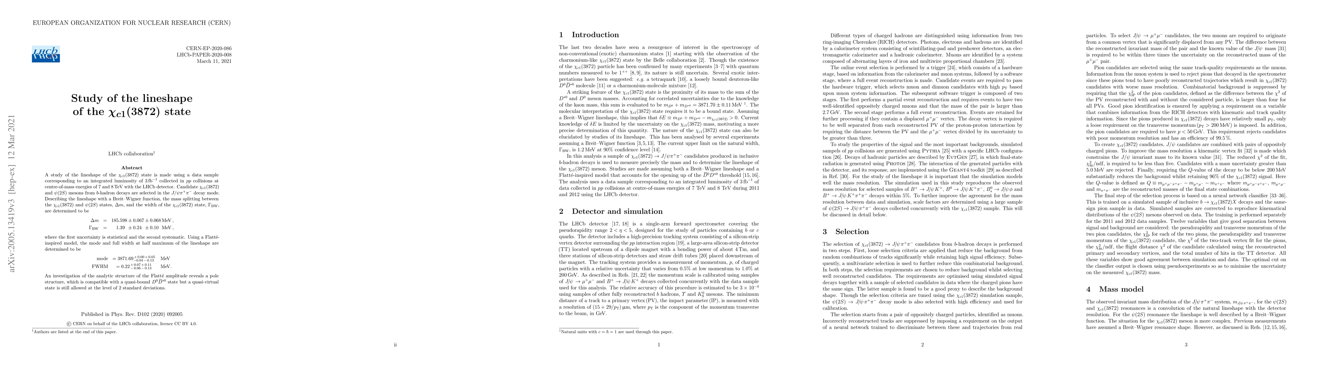 This study analyzes the lineshape of the $\chi_{c1}(3872)$ state using LHCb data from $pp$ collisions at 7 and 8 TeV, determining its mass splitting and width, and suggesting a possible quasi-bound $D^0\bar{D}^{*0}$ state. The mass splitting and width are found to be $\Delta m = 185.598 \pm 0.135$ MeV and $\Gamma_{\mathrm{BW}} = 1.39 \pm 0.34$ MeV, respectively.