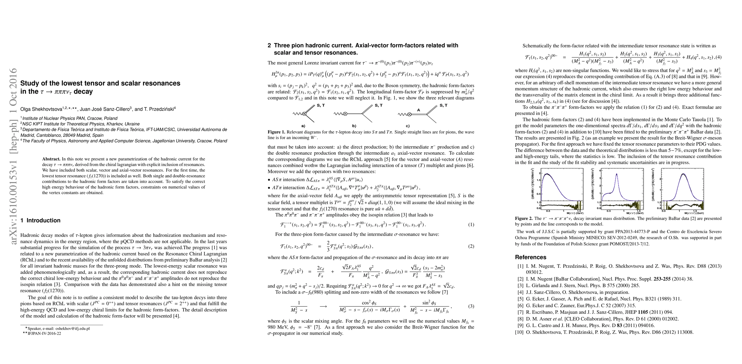 In this note we present a new parametrization of the hadronic current for the decay $\tau \to \pi\pi\pi \nu_\tau$ derived from the chiral lagrangian with explicit inclusion of resonances. We have included both scalar, vector and axial-vector resonances. For the first time, the lowest tensor resonance ($f_2(1270)$) is included as well. Both single and double-resonance contributions to the hadronic form factors are taken into account. To satisfy the correct high energy behaviour of the hadronic form factors, constraints on numerical values of the vertex constants are obtained.