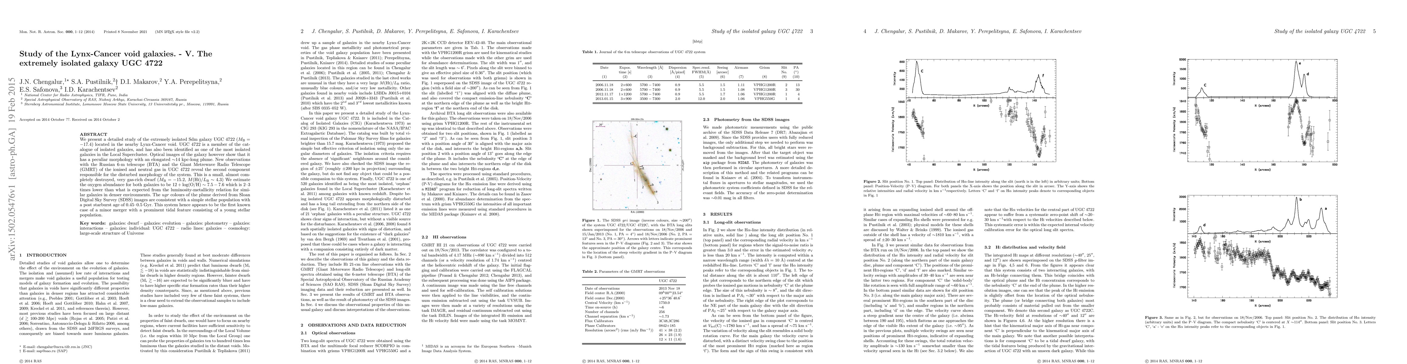 We present a detailed study of the extremely isolated Sdm galaxy UGC4722 (M_B = -17.4) located in the nearby Lynx-Cancer void. UGC4722 is a member of the catalogue of isolated galaxies, and has also been identified as one of the most isolated galaxies in the Local Supercluster. Optical images of the galaxy however show that it has a peculiar morphology with an elongated ~ 14 kpc long plume. New observations with the Russian 6-m telescope (BTA) and the Giant Metrewave Radio Telescope (GMRT) of the ionised and neutral gas in UGC4722 reveal the second component responsible for the disturbed morphology of the system. This is a small, almost completely destroyed, very gas-rich dwarf (M_B = -15.2, M_HI/L_B ~4.3). We estimate the oxygen abundance for both galaxies to be 12+log(O/H) ~ 7.5-7.6, which is 2-3 times lower than what is expected from the luminosity-metallicity relation for similar galaxies in denser environments. The ugr colours of the plume derived from Sloan Digital Sky Survey (SDSS) images are consistent with a simple stellar population with a post starburst age of 0.45-0.5 Gyr. This system hence appears to be the first known case of a minor merger with a prominent tidal feature consisting of a young stellar population.