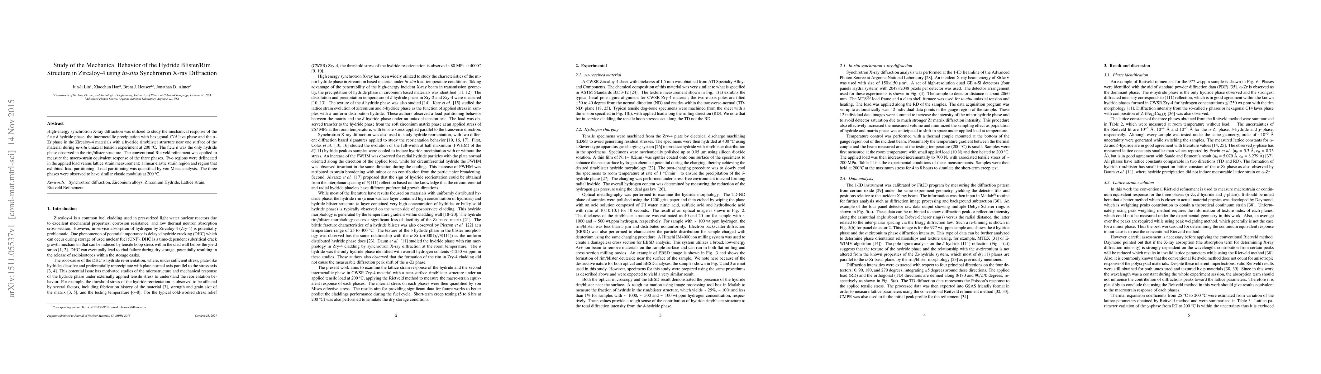 High-energy synchrotron X-ray diffraction was utilized to study the mechanical response of the f.c.c $\delta$-hydride phase, the intermetallic precipitation with hexagonal C14 lave phase and the $\alpha$-Zr phase in the Zircaloy-4 materials with a hydride rim/blister structure near one surface of the material during in-situ uniaxial tension experiment at 200 \si{\degreeCelsius}. The f.c.c $\delta$ was the only hydride phase observed in the rim/blister structure. The conventional Rietveld refinement was applied to measure the macro-strain equivalent response of the three phases. Two regions were delineated in the applied load versus lattice strain measurement: a linear elastic strain region and region that exhibited load partitioning. Load partitioning was quantified by von Mises analysis. The three phases were observed to have similar elastic modulus at 200 \si{\degreeCelsius}.