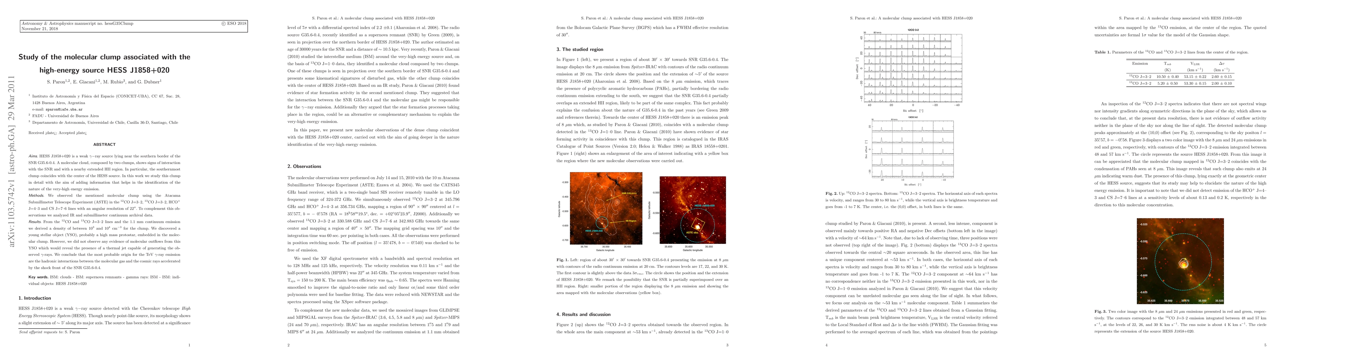 HESS J1858+020 is a weak gamma-ray source lying near the southern border of the SNR G35.6-0.4. A molecular cloud, composed by two clumps, shows signs of interaction with the SNR and with a nearby extended HII region. In particular, the southernmost clump coincides with the center of the HESS source. In this work we study this clump in detail with the aim of adding information that helps in the identification of the nature of the very-high energy emission. We observed the mentioned molecular clump using the Atacama Submillimeter Telescope Experiment (ASTE) in the 12CO J=3-2, 13CO J=3-2, HCO+ J=4-3 and CS J=7-6 lines with an angular resolution of 22". To complement this observations we analyzed IR and submillimeter continuum archival data. From the 12CO and 13CO J=3-2 lines and the 1.1 mm continuum emission we derived a density of between 10^{3} and 10^{4} cm^-3 for the clump. We discovered a young stellar object (YSO), probably a high mass protostar, embedded in the molecular clump. However, we did not observe any evidence of molecular outflows from this YSO which would reveal the presence of a thermal jet capable of generating the observed gamma-rays. We conclude that the most probable origin for the TeV gamma-ray emission are the hadronic interactions between the molecular gas and the cosmic rays accelerated by the shock front of the SNR G35.6-0.4.