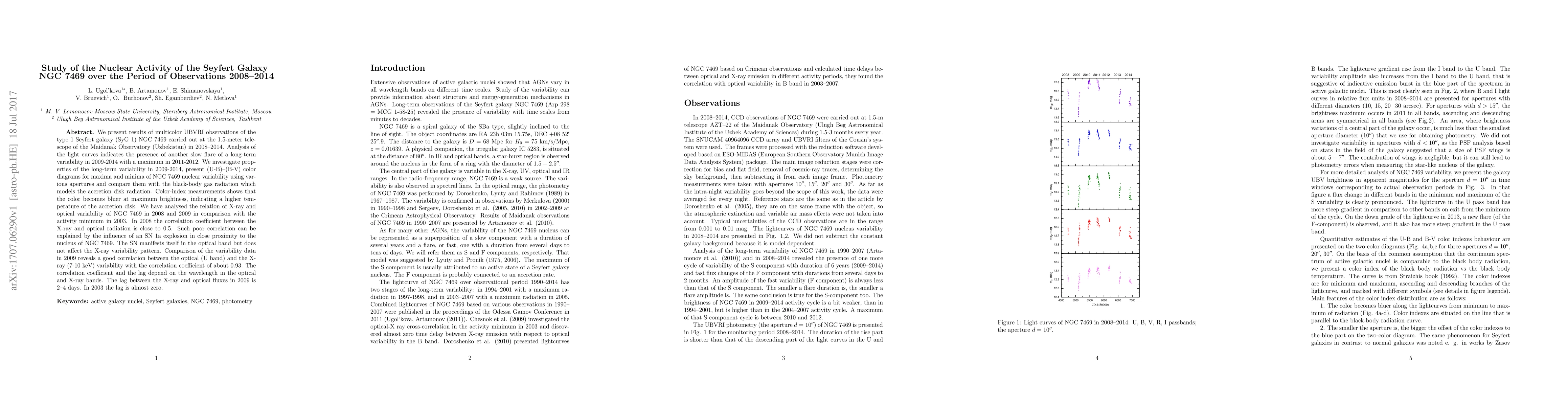 The study of Seyfert galaxy NGC 7469 from 2008-2014 using UBVRI observations at Maidanak Observatory revealed a long-term variability flare with a peak in 2011-2012. Color-index analysis showed bluer colors during maxima, indicating a hotter accretion disk. The research also explored the correlation between X-ray and optical variability, finding a significant correlation in 2009, but not in 2008 due to a nearby SN 1a explosion's influence in the optical band.