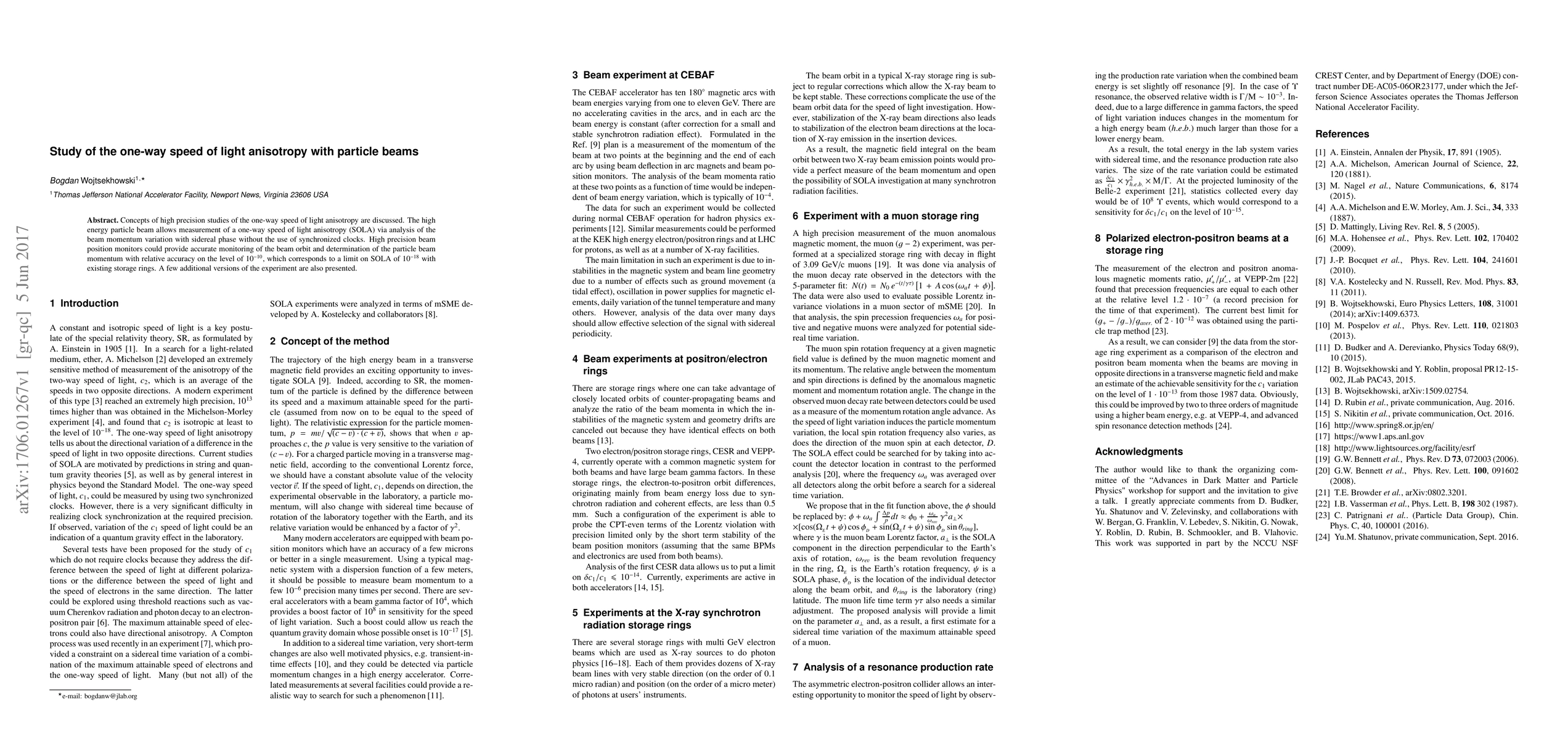 Concepts of high precision studies of the one-way speed of light anisotropy are discussed. The high energy particle beam allows measurement of a one-way speed of light anisotropy (SOLA) via analysis of the beam momentum variation with sidereal phase without the use of synchronized clocks. High precision beam position monitors could provide accurate monitoring of the beam orbit and determination of the particle beam momentum with relative accuracy on the level of $10^{-10}$, which corresponds to a limit on SOLA of $10^{-18}$ with existing storage rings. A few additional versions of the experiment are also presented.