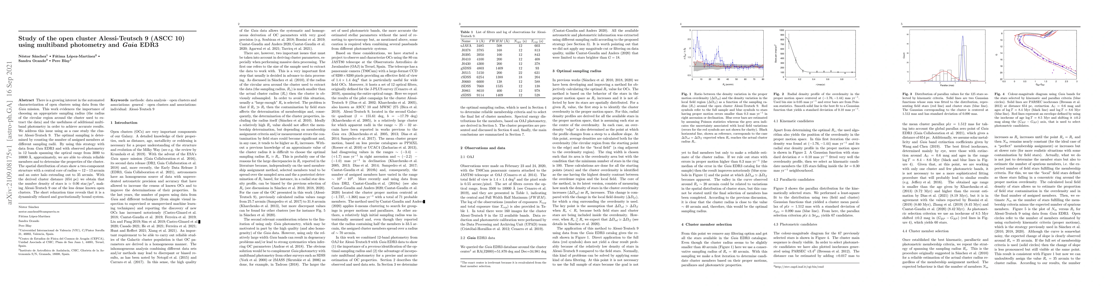 There is a growing interest in the automated characterization of open clusters using data from the Gaia mission. This work evidences the importance of choosing an appropriate sampling radius (the radius of the circular region around the cluster used to extract the data) and the usefulness of additional multiband photometry in order to achieve accurate results. We address this issue using as a case study the cluster Alessi-Teutsch 9. The optimal sampling is determined by counting the number of assigned members at different sampling radii. By using this strategy with data from Gaia EDR3 and with observed photometry in 12 bands spanning the optical range from 3000 to 10000 \AA, approximately, we are able to obtain reliable members and to determine the properties of the cluster. The spatial distribution of stars show a two-component structure with a central core of radius ~12-13 arcmin and an outer halo extending out to 35 arcmin. With the derived cluster distance (654 pc) we obtain that the number density of stars is ~0.06 star/pc^3, making Alessi-Teutsch 9 one of the less dense known open clusters. The short relaxation time reveals that it is a dynamically relaxed and gravitationally bound system.
