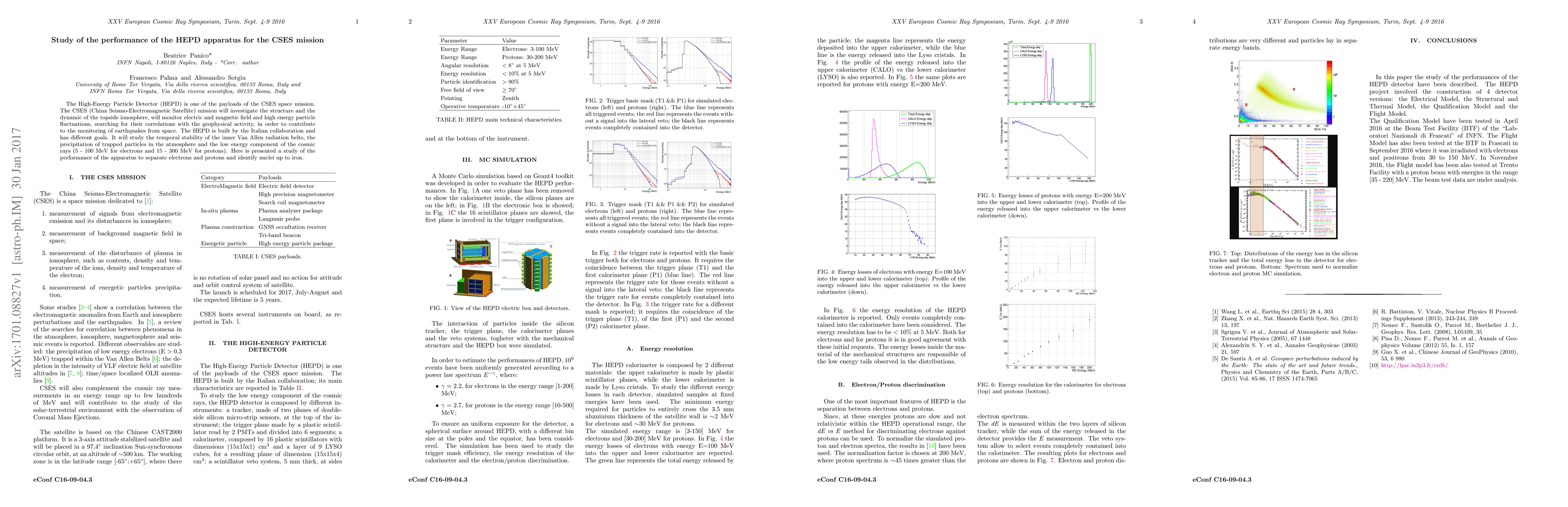 The research paper details the performance study of the High-Energy Particle Detector (HEPD) for China's CSES (China Seismo-Electromagnetic Satellite) mission. The HEPD, developed by an Italian collaboration, aims to distinguish between electrons and protons, and identify nuclei up to iron, thereby contributing to understanding the temporal stability of inner Van Allen radiation belts, trapped particle atmospheric precipitation, and the low energy part of cosmic rays.