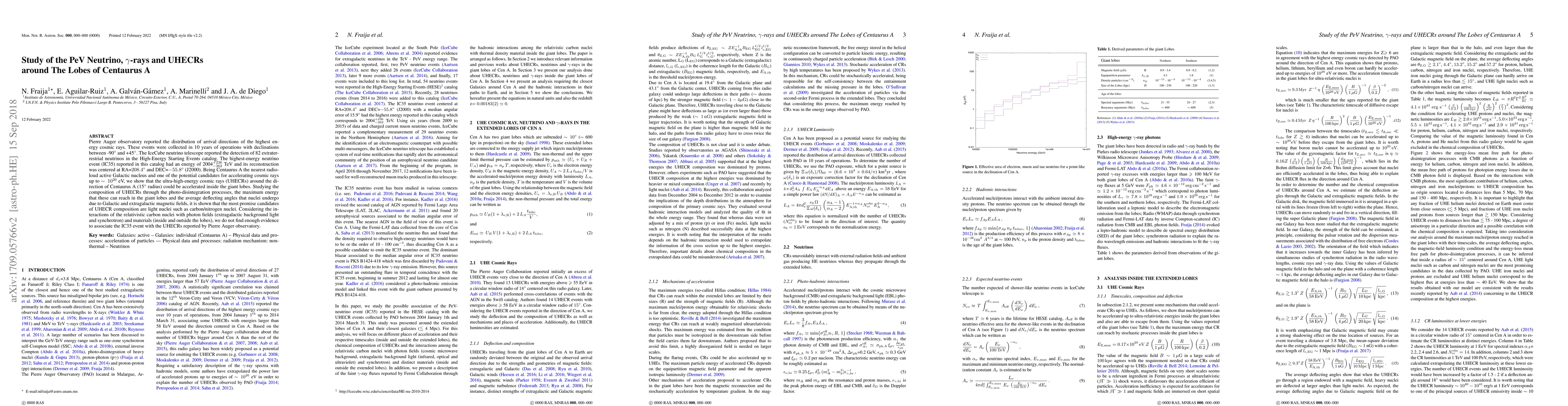 Pierre Auger observatory reported the distribution of arrival directions of the highest energy cosmic rays. These events were collected in 10 years of operations with declinations between -90$^\circ$ and +45$^\circ$. The IceCube neutrino telescope reported the detection of 82 extraterrestrial neutrinos in the High-Energy Starting Events catalog. The highest-energy neutrino event (IC35) reported in this catalog had an energy of 2004$^{+236}_{-262}$ TeV and its reconstruction was centered at RA=$208.4^\circ$ and DEC=$-55.8^\circ$ (J2000). Being Centaurus A the nearest radio-loud active Galactic nucleus and one of the potential candidates for accelerating cosmic rays up to $\sim\, 10^{20}$ eV, we show that the ultra-high-energy cosmic rays (UHECRs) around the direction of Centaurus A (15$^\circ$ radius) could be accelerated inside the giant lobes. Studying the composition of UHECRs through the photo-disintegration processes, the maximum energy that these can reach in the giant lobes and the average deflecting angles that nuclei undergo due to Galactic and extragalactic magnetic fields, it is shown that the most promise candidates of UHECR composition are light nuclei such as carbon/nitrogen nuclei. Considering the interactions of the relativistic carbon nuclei with photon fields (extragalactic background light and synchrotron) and materials (inside and outside the lobes), we do not find enough evidence to associate the IC35 event with the UHECRs reported by Pierre Auger observatory.
