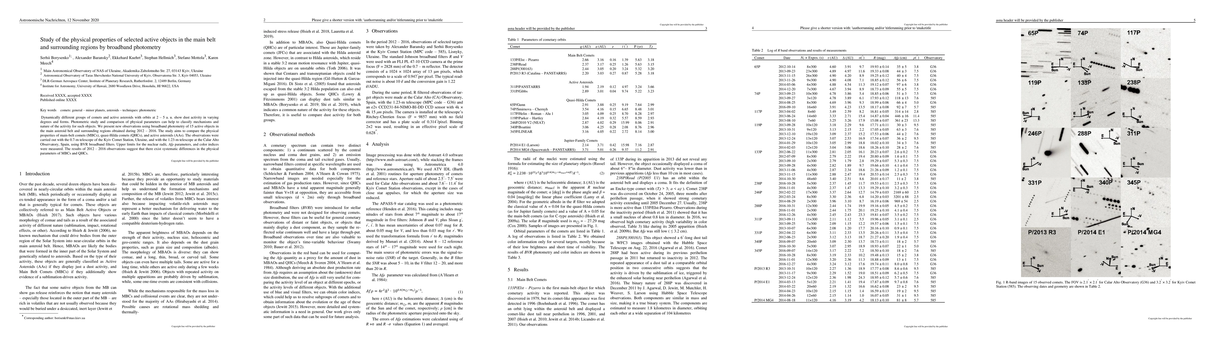 This study uses broadband photometry to analyze the physical properties of 15 active objects in the main asteroid belt and surrounding regions, identifying systematic differences between main-belt comets, quasi-Hilda comets, and active asteroids. Observations were conducted using telescopes in Ukraine and Spain, revealing distinct characteristics in the objects' nuclear radii, Afrho parameters, and color indices.