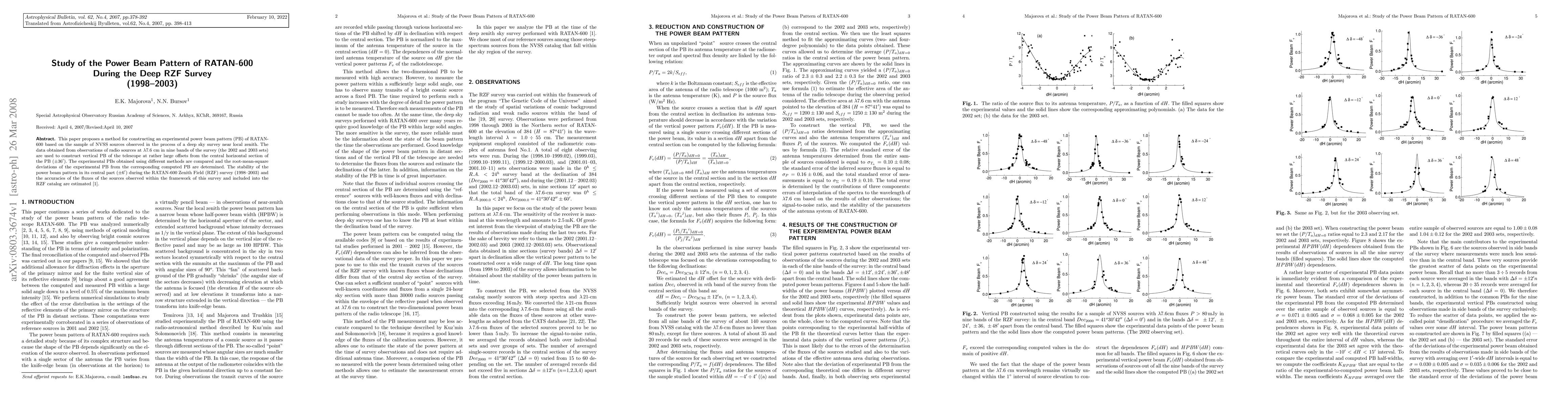 This paper proposes a method for constructing an experimental power beam pattern (PB) of RATAN-600 based on the sample of NVSS sources observed in the process of a deep sky survey near local zenith. The data obtained from observations of radio sources at wave 7.6 cm in nine bands of the survey (the 2002 and 2003 sets) are used to construct vertical PB of the telescope at rather large offsets from the central horizontal section of the PB (+/-36'). The experimental PBs obtained using different methods are compared and the root-mean-square deviations of the experimental PB from the corresponding computed PB are determined. The stability of the power beam pattern in its central part (+/-6') during the RATAN-600 Zenith Field (RZF) survey (1998-2003) and the accuracies of the fluxes of the sources observed within the framework of this survey and included into the RZF catalog are estimated.