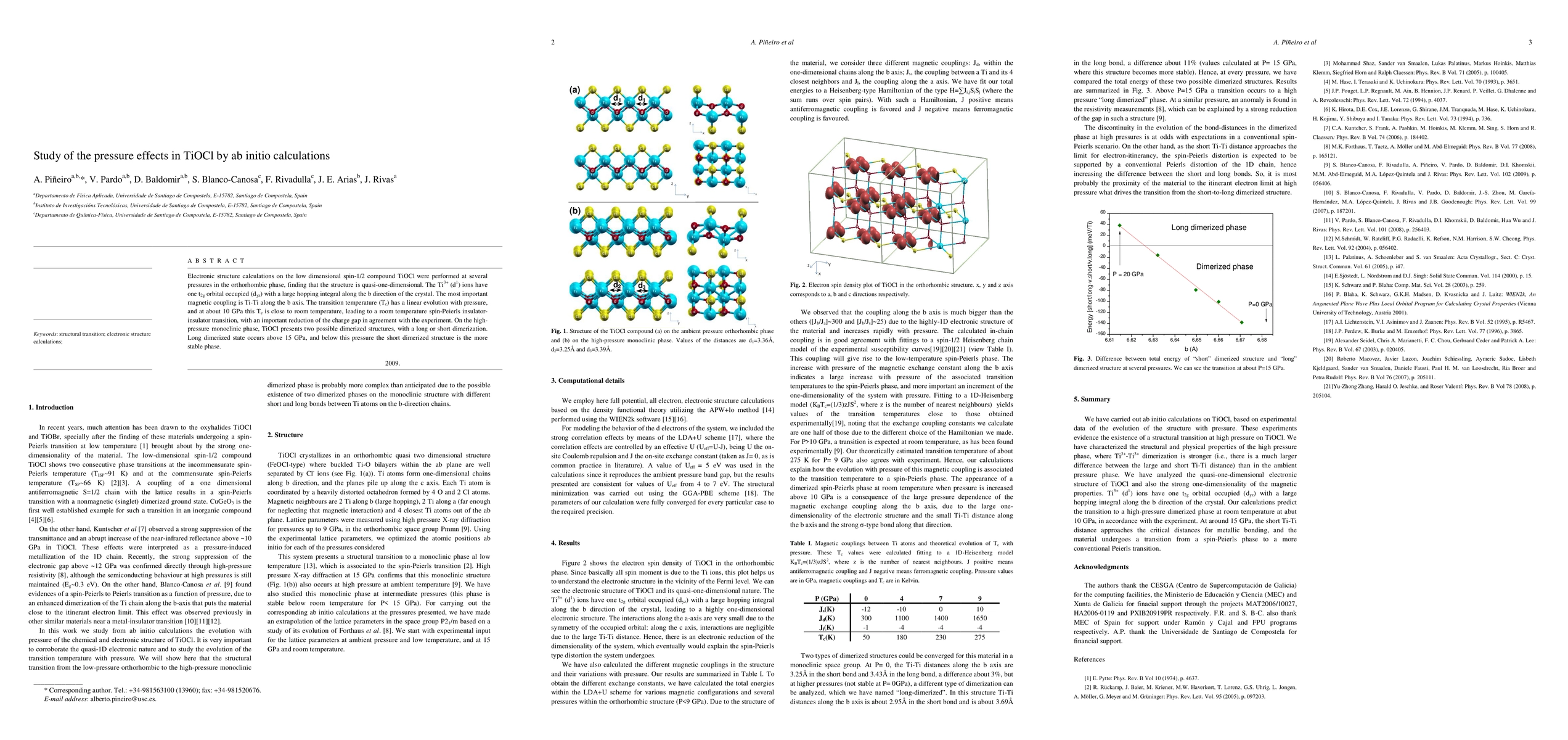 Researchers used ab initio calculations to study the effects of pressure on TiOCl, finding that it transforms into a spin-Peierls insulator-insulator transition at around 10 GPa, with two stable dimerized structures emerging above 15 GPa.