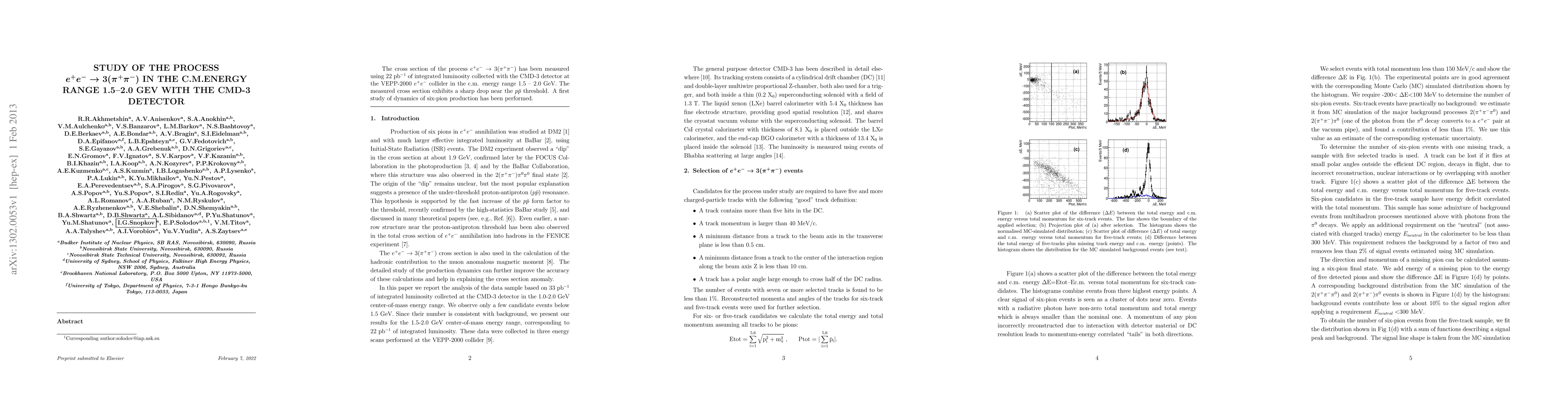 The research measures the cross section of the process $e^+e^- o 3(pi^+pi^-)$ using data from the CMD-3 detector at the VEPP-2000 collider, in the energy range 1.5 -- 2.0 GeV. It observes a sharp drop in cross section near the $par p$ threshold, marking the first study of six-pion production dynamics in this process.