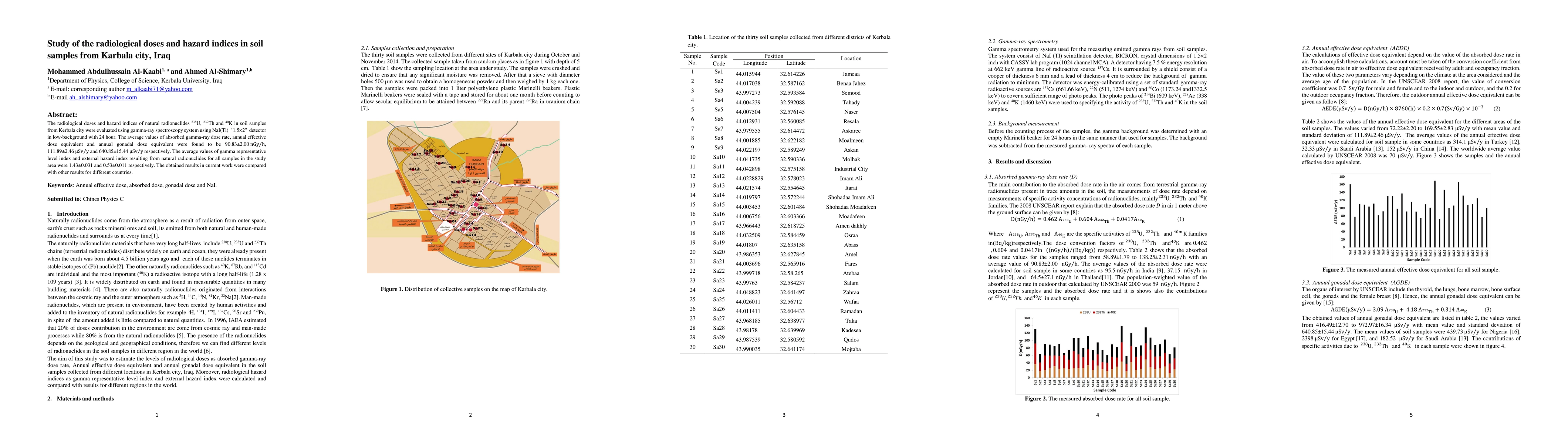 This study evaluated the radiological doses and hazard indices of natural radionuclides $^{238}$U, $^{232}$Th, and $^{40}$K in soil samples from Karbala city, Iraq, using gamma-ray spectroscopy. The findings indicate elevated annual effective and gonadal dose equivalents, with hazard indices suggesting potential radiation risks.