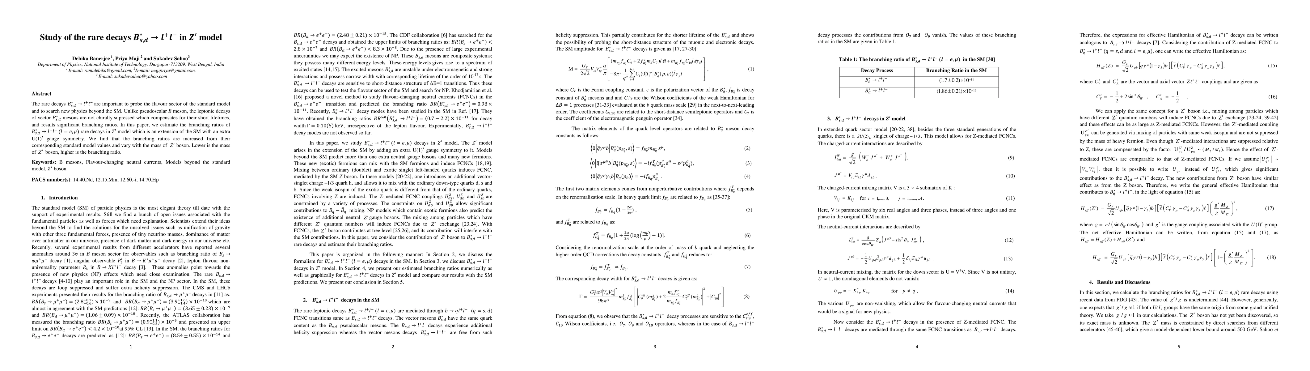 This paper investigates the rare decays of vector $B_{(s,d)}^*$ mesons into $l^+ l^-$ pairs in a Z' model, finding increased branching ratios compared to the Standard Model, with higher ratios corresponding to lower Z' boson masses.