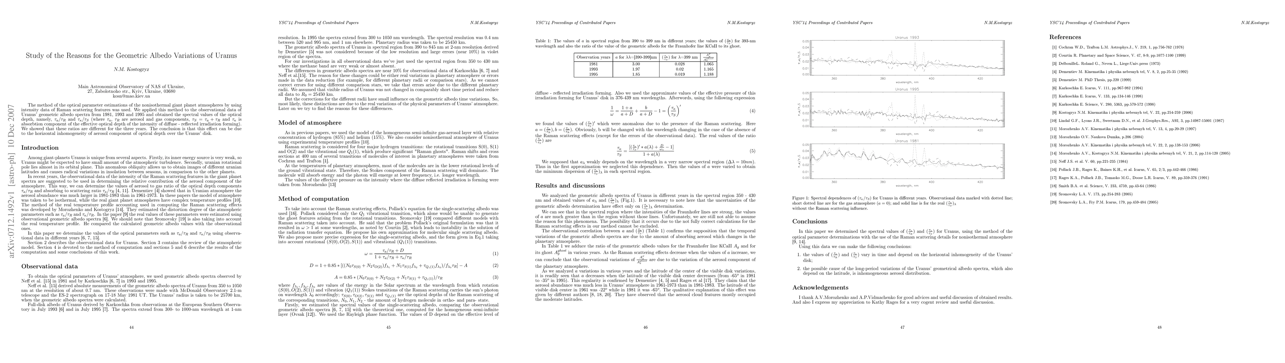 Researchers used Raman scattering data to study Uranus' geometric albedo variations over three years, finding differences in optical depth ratios that suggest horizontal aerosol component inhomogeneity.