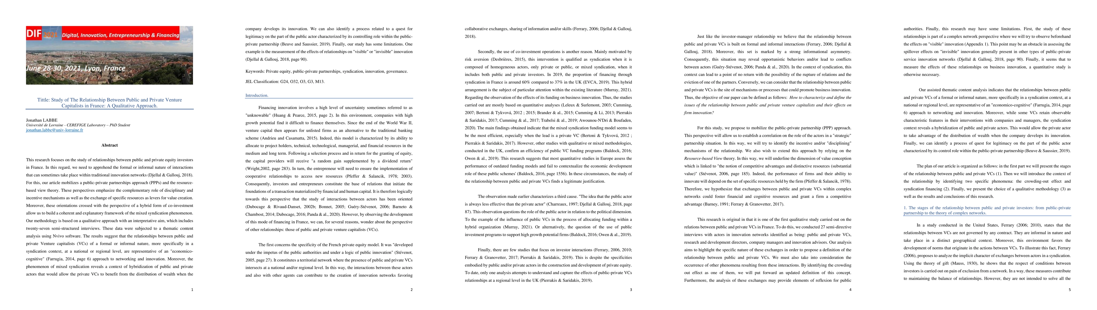 This research focuses on the study of relationships between public and private equity investors in France. In this regard, we need to apprehend the formal or informal nature of interactions that can sometimes take place within traditional innovation networks (Djellal \& Gallouj, 2018). For this, our article mobilizes a public-private partnerships approach (PPPs) and the resource-based view theory. These perspectives emphasize the complementary role of disciplinary and incentive mechanisms as well as the exchange of specific resources as levers for value creation. Moreover, these orientations crossed with the perspective of a hybrid form of co-investment allow us to build a coherent and explanatory framework of the mixed syndication phenomenon. Our methodology is based on a qualitative approach with an interpretative aim, which includes twenty-seven semi-structured interviews. These data were subjected to a thematic content analysis using Nvivo software. The results suggest that the relationships between public and private Venture capitalists (VCs) of a formal or informal nature, more specifically in a syndication context, at a national or regional level, are representative of an ''economico-cognitive'' (Farrugia, 2014, page 6) approach to networking and innovation. Moreover, the phenomenon of mixed syndication reveals a context of hybridization of public and private actors that would allow the private VCs to benefit from the distribution of wealth when the company develops its innovation. We can also identify a process related to a quest for legitimacy on the part of the public actor characterized by its controlling role within the public-private partnership (Beuve and Saussier, 2019). Finally, our study has some limitations. One example is the measurement of the effects of relationships on ''visible'' or ''invisible'' innovation (Djellal \& Gallouj, 2018, page 90).