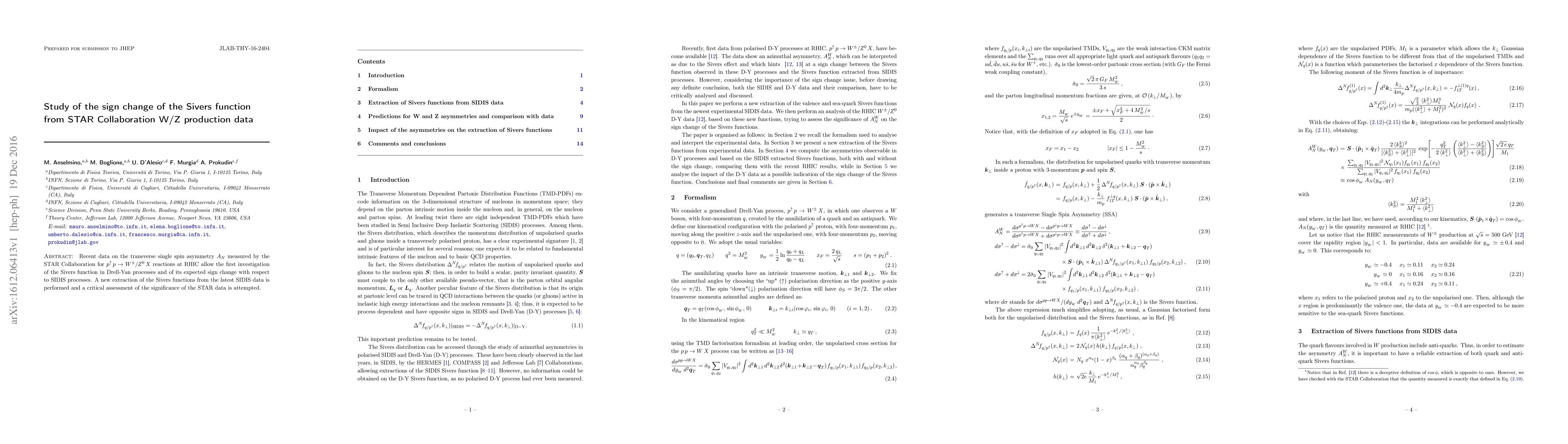This paper investigates the sign change of the Sivers function using STAR Collaboration's data on $W^\pm/Z^0$ production in transversely polarized proton collisions at RHIC, comparing it to Drell-Yan processes and SIDIS data to assess the significance of the observed asymmetry. A new extraction of Sivers functions from SIDIS data is also presented.