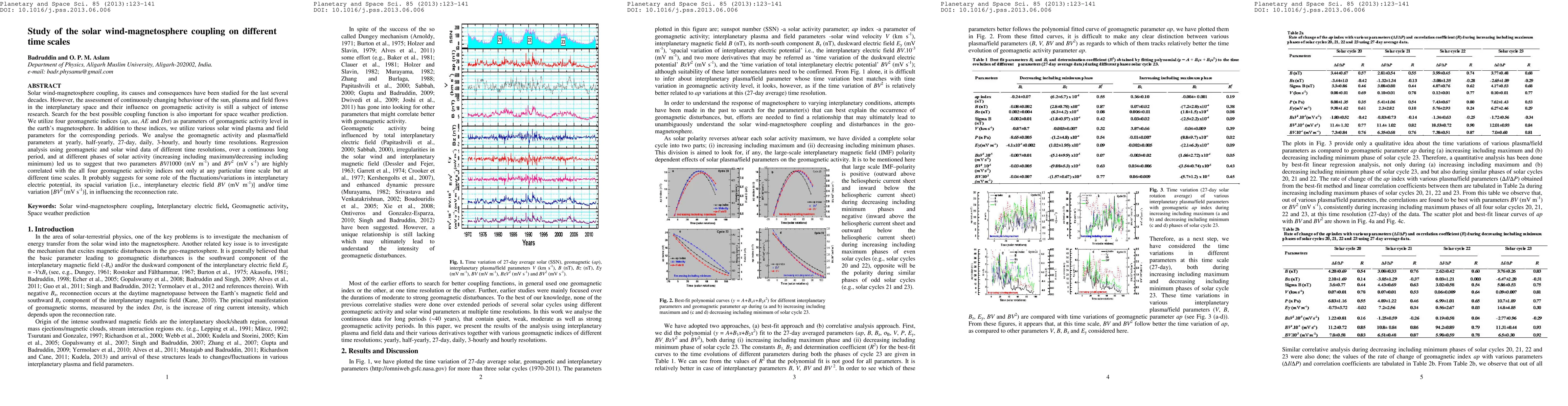 This study investigates the solar wind-magnetosphere coupling across various time scales, utilizing geomagnetic and solar wind parameters. The analysis reveals that two parameters, BV/1000 and BV2, are highly correlated with geomagnetic activity indices across different time scales, suggesting the influence of interplanetary electric field variations on reconnection rates.