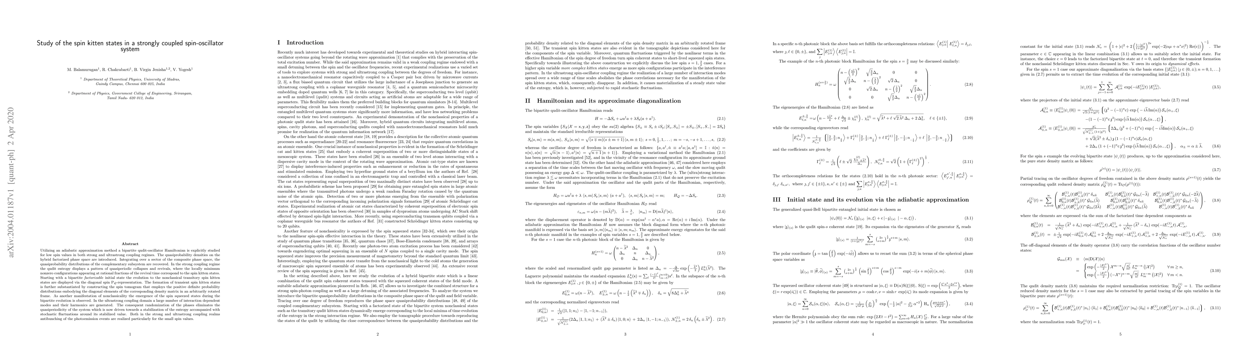 This study investigates spin kitten states in a strongly coupled spin-oscillator system using adiabatic approximation and quasiprobability densities. It reveals quasiperiodic entropy behavior and transient spin kitten states in the strong coupling regime, while in ultrastrong coupling, the system stabilizes with stochastic fluctuations and antibunching of photoemission events.
